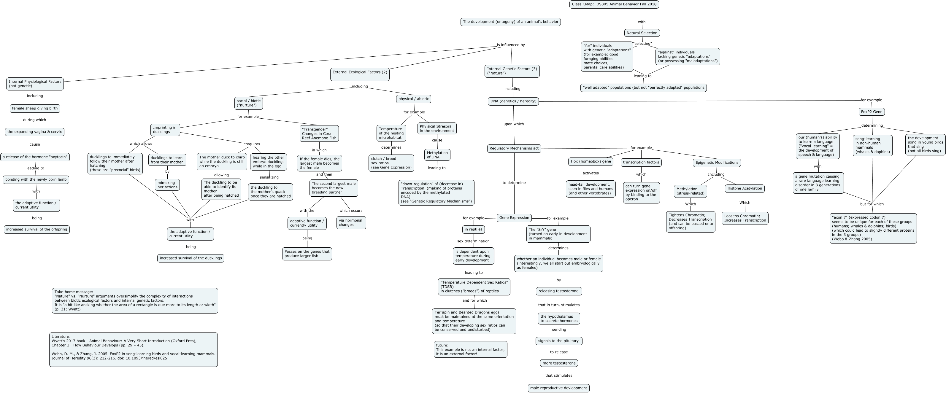 This Concept Map, created with IHMC CmapTools, has information related to: Development Wyatt Ch 3 092818 Final, social / biotic ("nurture") for example Imprinting in ducklings, Regulatory Mechanisms act to determine Gene Expression, bonding with the newly born lamb with the adaptive function / current utlity, the hypothalamus to secrete hormones sending signals to the pituitary, Methylation of DNA leading to "down-regulation" of (decrease in) Transcription (making of proteins encoded by the methylated DNA) (see "Genetic Regulatory Mechanisms"), Gene Expression for example The "SrY" gene (turned on early in development in mammals), physical / abiotic for example Phylsical Stresors in the environment, Histone Acetylation Which Loosens Chromatin; Increases Transcription, "Transgender" Changes in Coral Reef Anemone Fish in which If the female dies, the largest male becomes the female, The "SrY" gene (turned on early in development in mammals) determines whether an individual becomes male or female (interestingly, we all start out embryologically as females), FoxP2 Gene determining song-learning in non-human mammals (whales & dophins), Internal Physiological Factors (not genetic) including female sheep giving birth, Imprinting in ducklings requires hearing the other embryo ducklings while in the egg, female sheep giving birth during which the expanding vagina & cervix, the duckling to the mother's quack once they are hatched with the adaptive function / current utlity, The development (ontogeny) of an animal's behavior with Natural Selection, mimcking her actions with the adaptive function / current utlity, the development song in young birds that sing (not all birds sing) but for which "exon 7" (expressed codon 7) seems to be unique for each of these groups (humans; whales & dolphins; birds) (which could lead to slightly different proteins in the 3 groups) (Webb & Zhang 2005), hearing the other embryo ducklings while in the egg sensitizing the duckling to the mother's quack once they are hatched, DNA (genetics / heredity) upon which Regulatory Mechanisms act