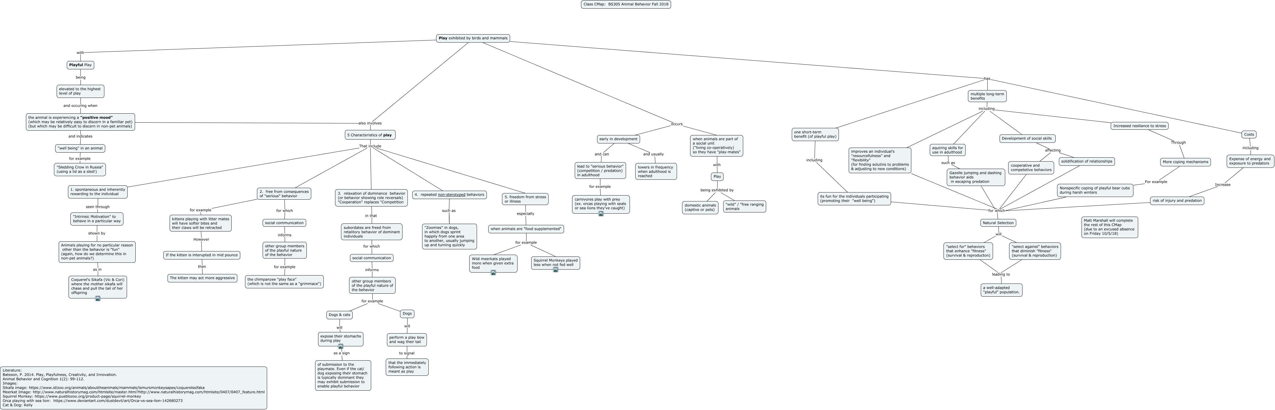 This Concept Map, created with IHMC CmapTools, has information related to: Play in animals 100118, 5 Characteristics of play That include 4. repeated non-sterotyped behaviors, social communication informs other group members of the playful nature of the behavior, If the kitten is interupted in mid pounce then The kitten may act more aggressive, 5 Characteristics of play That include 5. freedom from stress or illness, multiple long-term benefits including aquiring skills for use in adulthood, Play exhibited by birds and mammals has multiple long-term benefits, Gazelle jumping and dashing behavior aids in escaping predation for which Natural Selection, "Intrinsic Motivation" to behave in a particular way shown by Animals playing for no particular reason other than the behavior is "fun" (again, how do we determine this in non-pet animals?), when animals are part of a social unit ("living co-operatively) so they have "play-mates" with Play, 5 Characteristics of play That include 2. free from consequences of "serious" behavior, expose their stomachs during play as a sign of submission to the playmate. Even if the cat/ dog exposing their stomach is typically dominant they may exhibit submission to enable playful behavior, when animals are "food supplemented" for example Squirrel Monkeys played less when not fed well, Costs including Expense of energy and exposure to predators, multiple long-term benefits including improves an individual's "resourcefulness" and "flexibility" (for finding solutins to problems & adjusting to new conditions), improves an individual's "resourcefulness" and "flexibility" (for finding solutins to problems & adjusting to new conditions) for which Natural Selection, 4. repeated non-sterotyped behaviors such as "Zoomies" in dogs, in which dogs sprint happily from one area to another, usually jumping up and turning quickly, other group members of the playful nature of the behavior for example Dogs & cats, other group members of the playful nature of the behavior for example the chimpanzee "play face" (which is not the same as a "grimmace"), multiple long-term benefits including Increased resiliance to stress, Development of social skills affecting cooperative and competetive behaviors