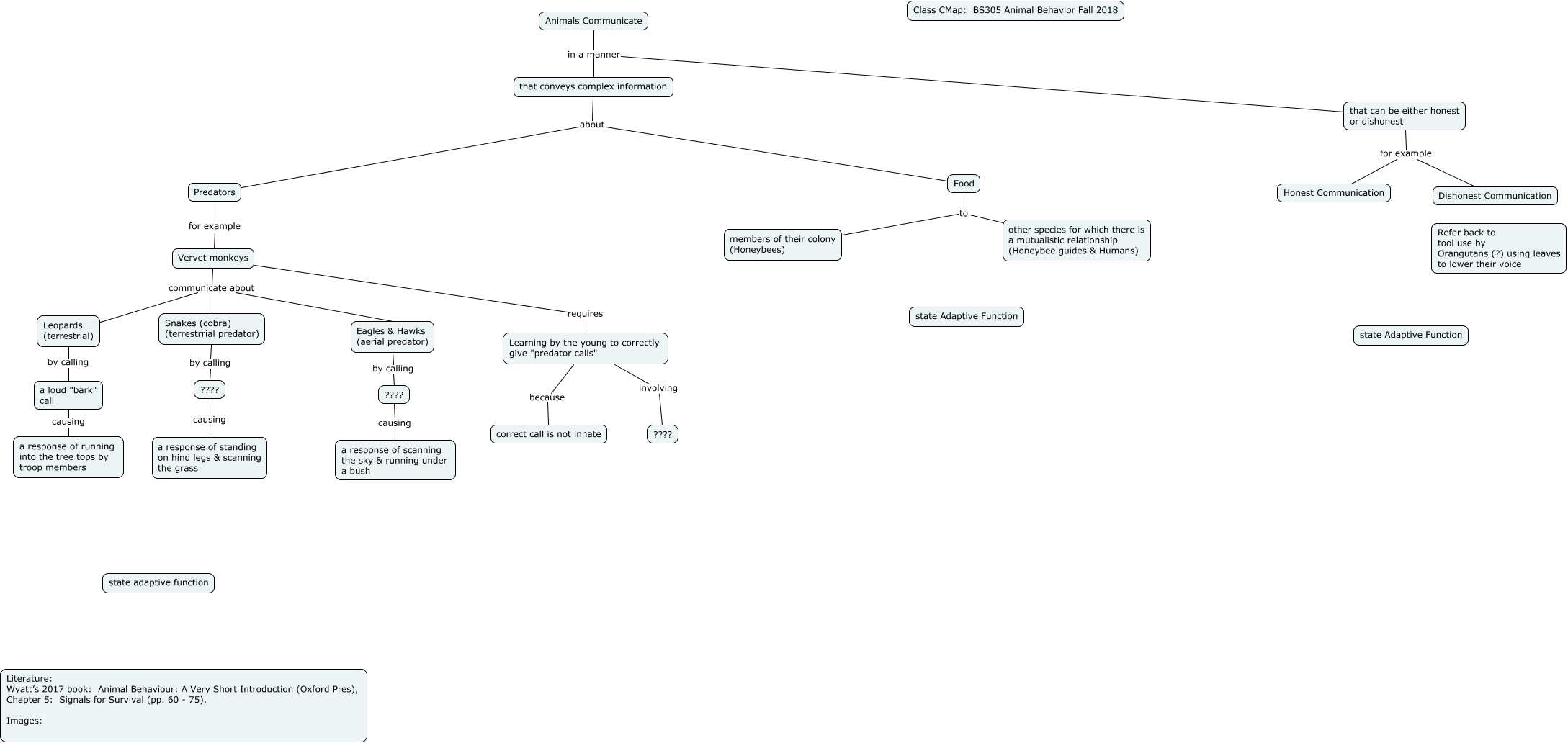 This Concept Map, created with IHMC CmapTools, has information related to: Animal Communication Wyatt Ch. 5 101918, that can be either honest or dishonest for example Dishonest Communication, Leopards (terrestrial) by calling a loud "bark" call, Eagles & Hawks (aerial predator) by calling ????, Vervet monkeys communicate about Leopards (terrestrial), that conveys complex information about Food, Snakes (cobra) (terrestrrial predator) by calling ????, ???? causing a response of scanning the sky & running under a bush, that conveys complex information about Predators, ???? causing a response of standing on hind legs & scanning the grass, Vervet monkeys communicate about Eagles & Hawks (aerial predator), Predators for example Vervet monkeys, Learning by the young to correctly give "predator calls" because correct call is not innate, Vervet monkeys requires Learning by the young to correctly give "predator calls", Animals Communicate in a manner that can be either honest or dishonest, Vervet monkeys communicate about Snakes (cobra) (terrestrrial predator), that can be either honest or dishonest for example Honest Communication, a loud "bark" call causing a response of running into the tree tops by troop members, Food to other species for which there is a mutualistic relationship (Honeybee guides & Humans), Food to members of their colony (Honeybees), Learning by the young to correctly give "predator calls" involving ????