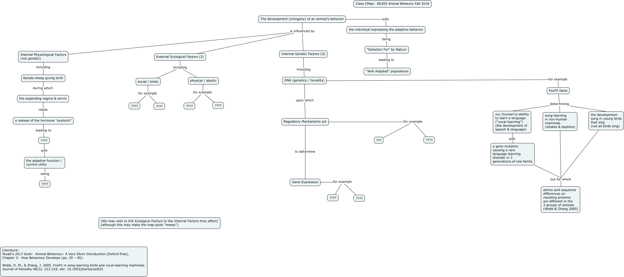 This Concept Map, created with IHMC CmapTools, has information related to: Development Wyatt Ch 3 092118, Gene Expression for example ????, female sheep giving birth during which the expanding vagina & cervix, the adaptive function / current utlity being ????, Gene Expression for example ????, FoxP2 Gene determining our (human's) abillity to learn a language ("vocal-learning") (the development of speech & language), DNA (genetics / heredity) for example FoxP2 Gene, The development (ontogeny) of an animal's behavior is influenced by Internal Physiological Factors (not genetic), External Ecological Factors (2) including social / biotic, DNA (genetics / heredity) upon which Regulatory Mechanisms act, the individual expressing the adaptive behavior being "Selection For" by Nature, The development (ontogeny) of an animal's behavior is influenced by Internal Genetic Factors (3), Internal Genetic Factors (3) including DNA (genetics / heredity), a gene mutation causing a rare language learning disorder in 3 generations of one family but for which amino acid sequence differences on resulting proteins are different in the 3 groups of animals (Webb & Zhang 2005), social / biotic for example ????, Regulatory Mechanisms act to determine Gene Expression, the expanding vagina & cervix cause a release of the hormone "oxytocin", FoxP2 Gene determining the development song in young birds that sing (not all birds sing), Regulatory Mechanisms act for example ???, physical / abiotic for example ????, "Selection For" by Nature leading to "Well Adapted" populations