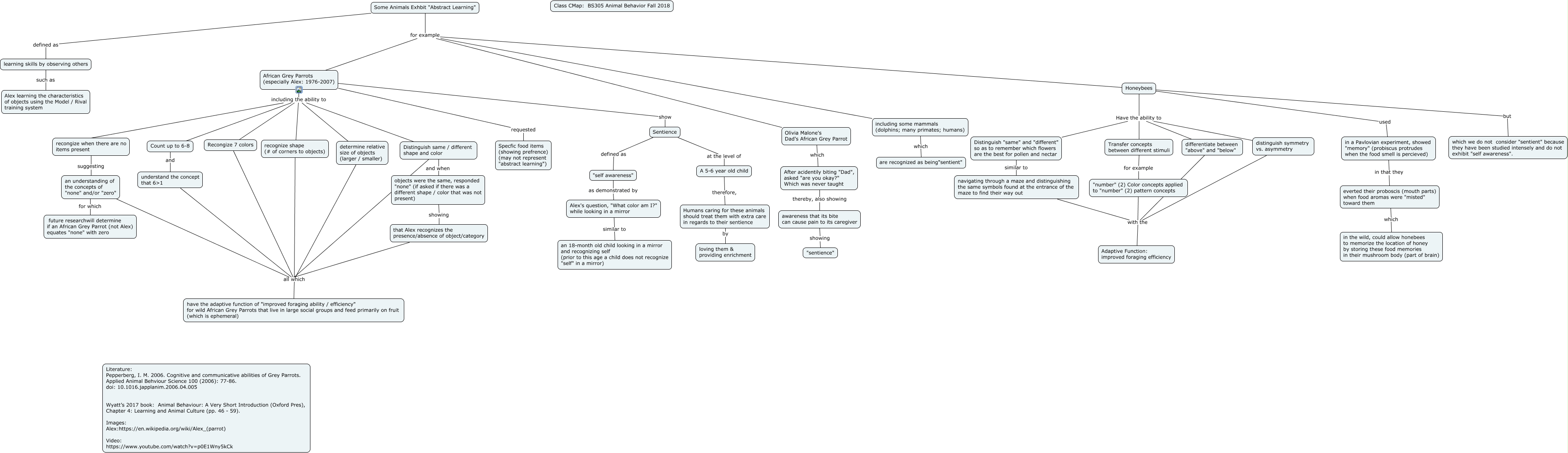 This Concept Map, created with IHMC CmapTools, has information related to: Abstract Learning (Alex and Honeybees) final 101918, A 5-6 year old child therefore, Humans caring for these animals should treat them with extra care in regards to their sentience, African Grey Parrots (especially Alex: 1976-2007) including the ability to Distinguish same / different shape and color, Transfer concepts between different stimuli for example "number" (2) Color concepts applied to "number" (2) pattern concepts, Honeybees Have the ability to differentiate between "above" and "below", an understanding of the concepts of "none" and/or "zero" for which future researchwill determine if an African Grey Parrot (not Alex) equates "none" with zero, Some Animals Exhbit "Abstract Learning" for example Olivia Malone's Dad's African Grey Parrot, understand the concept that 6ɭ all which have the adaptive function of "improved foraging ability / efficiency" for wild African Grey Parrots that live in large social groups and feed primarily on fruit (which is ephemeral), Humans caring for these animals should treat them with extra care in regards to their sentience by loving them & providing enrichment, Honeybees Have the ability to Distinguish "same" and "different" so as to remember which flowers are the best for pollen and nectar, African Grey Parrots (especially Alex: 1976-2007) including the ability to determine relative size of objects (larger / smaller), Count up to 6-8 and understand the concept that 6ɭ, Honeybees Have the ability to distinguish symmetry vs. asymmetry, Some Animals Exhbit "Abstract Learning" defined as learning skills by observing others, Some Animals Exhbit "Abstract Learning" for example African Grey Parrots (especially Alex: 1976-2007), Honeybees Have the ability to Transfer concepts between different stimuli, Recongize 7 colors all which have the adaptive function of "improved foraging ability / efficiency" for wild African Grey Parrots that live in large social groups and feed primarily on fruit (which is ephemeral), everted their proboscis (mouth parts) when food aromas were "misted" toward them which in the wild, could allow honebees to memorize the location of honey by storing these food memories in their mushroom body (part of brain), determine relative size of objects (larger / smaller) all which have the adaptive function of "improved foraging ability / efficiency" for wild African Grey Parrots that live in large social groups and feed primarily on fruit (which is ephemeral), Sentience defined as "self awareness", Distinguish same / different shape and color and when objects were the same, responded "none" (if asked if there was a different shape / color that was not present)