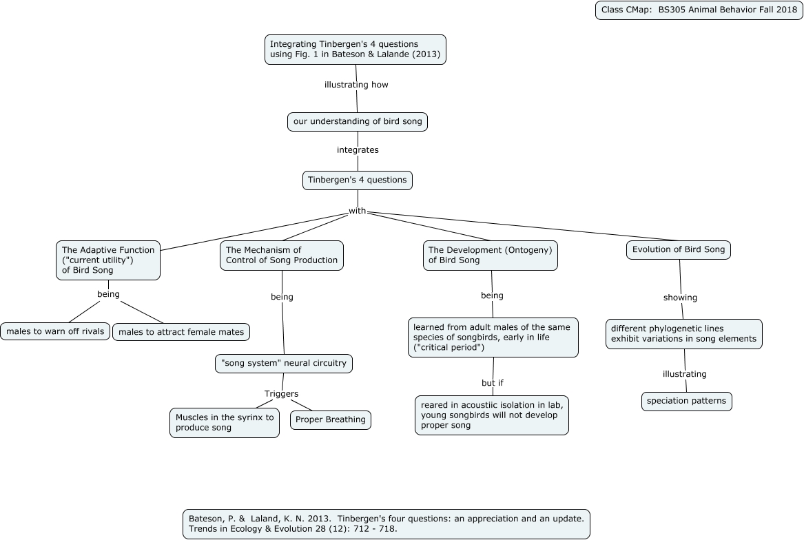 This Concept Map, created with IHMC CmapTools, has information related to: Bateson & Laland's Fig. 1, "song system" neural circuitry Triggers Proper Breathing, our understanding of bird song integrates Tinbergen's 4 questions, The Adaptive Function ("current utility") of Bird Song being males to attract female mates, different phylogenetic lines exhibit variations in song elements illustrating speciation patterns, Tinbergen's 4 questions with The Adaptive Function ("current utility") of Bird Song, The Mechanism of Control of Song Production being "song system" neural circuitry, Tinbergen's 4 questions with Evolution of Bird Song, Tinbergen's 4 questions with The Development (Ontogeny) of Bird Song, Evolution of Bird Song showing different phylogenetic lines exhibit variations in song elements, The Development (Ontogeny) of Bird Song being learned from adult males of the same species of songbirds, early in life ("critical period"), The Adaptive Function ("current utility") of Bird Song being males to warn off rivals, learned from adult males of the same species of songbirds, early in life ("critical period") but if reared in acoustiic isolation in lab, young songbirds will not develop proper song, Integrating Tinbergen's 4 questions using Fig. 1 in Bateson & Lalande (2013) illustrating how our understanding of bird song, "song system" neural circuitry Triggers Muscles in the syrinx to produce song, Tinbergen's 4 questions with The Mechanism of Control of Song Production