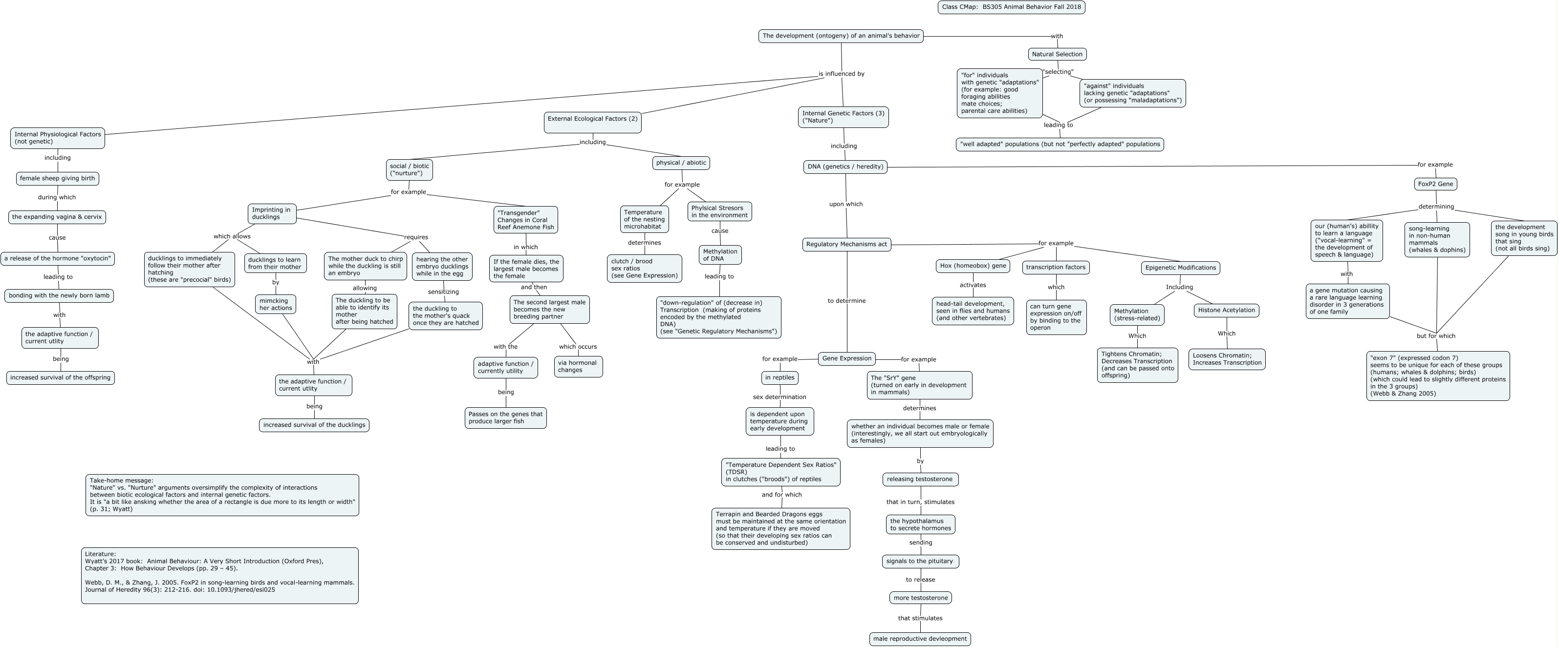This Concept Map, created with IHMC CmapTools, has information related to: Development Wyatt Ch 3 092818 Final copy, social / biotic ("nurture") for example Imprinting in ducklings, Regulatory Mechanisms act to determine Gene Expression, bonding with the newly born lamb with the adaptive function / current utlity, the hypothalamus to secrete hormones sending signals to the pituitary, Methylation of DNA leading to "down-regulation" of (decrease in) Transcription (making of proteins encoded by the methylated DNA) (see "Genetic Regulatory Mechanisms"), Gene Expression for example The "SrY" gene (turned on early in development in mammals), physical / abiotic for example Phylsical Stresors in the environment, Histone Acetylation Which Loosens Chromatin; Increases Transcription, "Transgender" Changes in Coral Reef Anemone Fish in which If the female dies, the largest male becomes the female, The "SrY" gene (turned on early in development in mammals) determines whether an individual becomes male or female (interestingly, we all start out embryologically as females), FoxP2 Gene determining song-learning in non-human mammals (whales & dophins), Internal Physiological Factors (not genetic) including female sheep giving birth, Imprinting in ducklings requires hearing the other embryo ducklings while in the egg, female sheep giving birth during which the expanding vagina & cervix, the duckling to the mother's quack once they are hatched with the adaptive function / current utlity, The development (ontogeny) of an animal's behavior with Natural Selection, mimcking her actions with the adaptive function / current utlity, the development song in young birds that sing (not all birds sing) but for which "exon 7" (expressed codon 7) seems to be unique for each of these groups (humans; whales & dolphins; birds) (which could lead to slightly different proteins in the 3 groups) (Webb & Zhang 2005), hearing the other embryo ducklings while in the egg sensitizing the duckling to the mother's quack once they are hatched, DNA (genetics / heredity) upon which Regulatory Mechanisms act