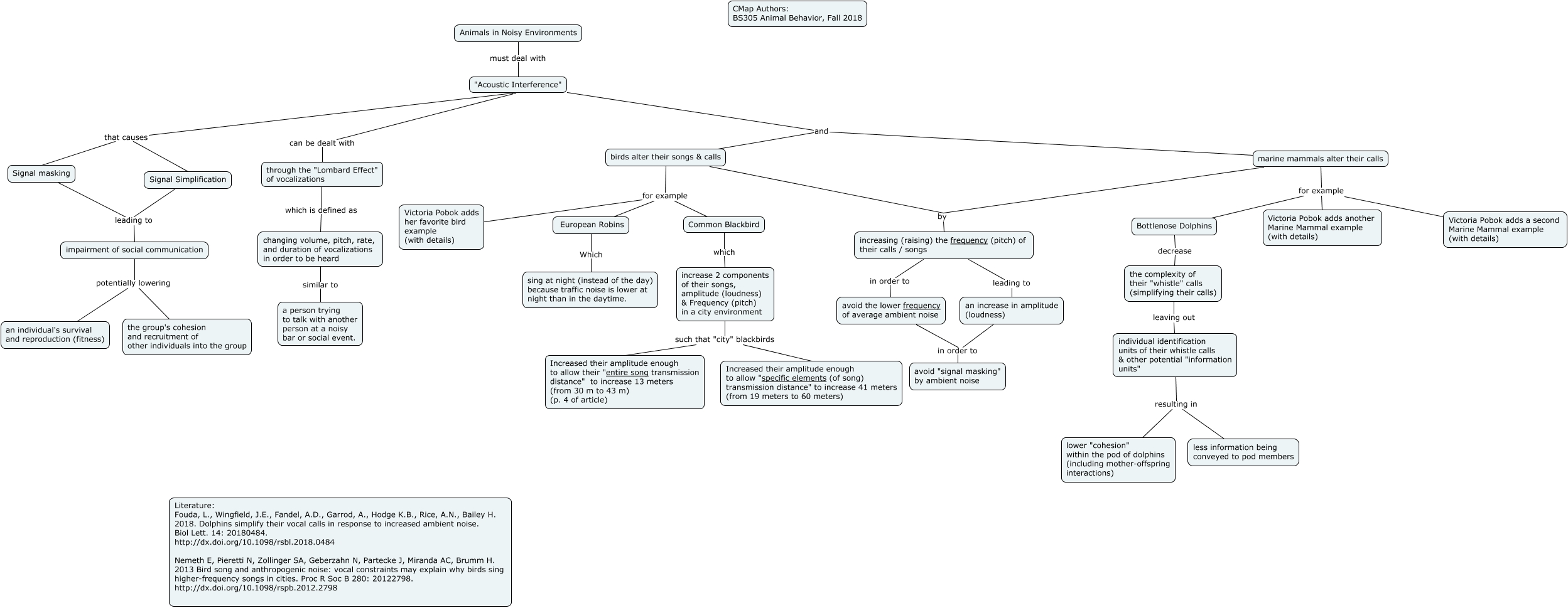 This Concept Map, created with IHMC CmapTools, has information related to: Songs and Calls in Noisy Environs 112818, increase 2 components of their songs, amplitude (loudness) & Frequency (pitch) in a city environment such that "city" blackbirds Increased their amplitude enough to allow "specific elements (of song) transmission distance" to increase 41 meters (from 19 meters to 60 meters), Animals in Noisy Environments must deal with "Acoustic Interference", Signal masking leading to impairment of social communication, birds alter their songs & calls for example Common Blackbird, marine mammals alter their calls for example Bottlenose Dolphins, Signal Simplification leading to impairment of social communication, "Acoustic Interference" and marine mammals alter their calls, changing volume, pitch, rate, and duration of vocalizations in order to be heard similar to a person trying to talk with another person at a noisy bar or social event., "Acoustic Interference" and birds alter their songs & calls, the complexity of their "whistle" calls (simplifying their calls) leaving out individual identification units of their whistle calls & other potential "information units", through the "Lombard Effect" of vocalizations which is defined as changing volume, pitch, rate, and duration of vocalizations in order to be heard, marine mammals alter their calls for example Victoria Pobok adds another Marine Mammal example (with details), "Acoustic Interference" that causes Signal Simplification, an increase in amplitude (loudness) in order to avoid "signal masking" by ambient noise, increasing (raising) the frequency (pitch) of their calls / songs in order to avoid the lower frequency of average ambient noise, increasing (raising) the frequency (pitch) of their calls / songs leading to an increase in amplitude (loudness), European Robins Which sing at night (instead of the day) because traffic noise is lower at night than in the daytime., birds alter their songs & calls by increasing (raising) the frequency (pitch) of their calls / songs, "Acoustic Interference" can be dealt with through the "Lombard Effect" of vocalizations, impairment of social communication potentially lowering an individual's survival and reproduction (fitness)