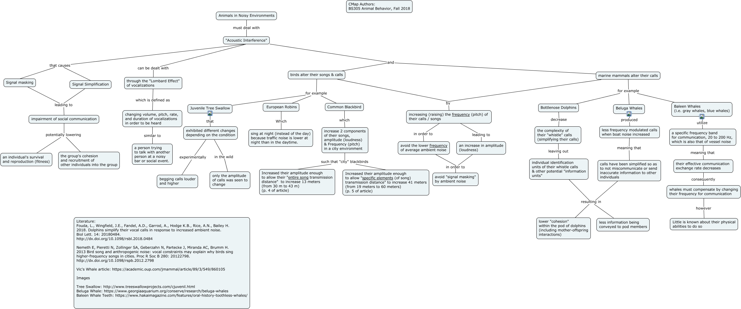 This Concept Map, created with IHMC CmapTools, has information related to: Songs and Calls in Noisy Environs 112818 plus Pobok, increasing (raising) the frequency (pitch) of their calls / songs leading to an increase in amplitude (loudness), "Acoustic Interference" and marine mammals alter their calls, exhibited different changes depending on the condition experimentally begging calls louder and higher, marine mammals alter their calls for example Beluga Whales, "Acoustic Interference" that causes Signal Simplification, through the "Lombard Effect" of vocalizations which is defined as changing volume, pitch, rate, and duration of vocalizations in order to be heard, calls have been simplified so as to not miscommunicate or send inaccurate information to other individuals resulting in lower "cohesion" within the pod of dolphins (including mother-offspring interactions), changing volume, pitch, rate, and duration of vocalizations in order to be heard similar to a person trying to talk with another person at a noisy bar or social event., avoid the lower frequency of average ambient noise in order to avoid "signal masking" by ambient noise, birds alter their songs & calls for example European Robins, Signal masking leading to impairment of social communication, increasing (raising) the frequency (pitch) of their calls / songs in order to avoid the lower frequency of average ambient noise, impairment of social communication potentially lowering an individual's survival and reproduction (fitness), European Robins Which sing at night (instead of the day) because traffic noise is lower at night than in the daytime., less frequency modulated calls when boat noise increased meaning that calls have been simplified so as to not miscommunicate or send inaccurate information to other individuals, Animals in Noisy Environments must deal with "Acoustic Interference", marine mammals alter their calls by increasing (raising) the frequency (pitch) of their calls / songs, a specific frequency band for communication, 20 to 200 Hz, which is also that of vessel noise meaning that their effective communication exchange rate decreases, Bottlenose Dolphins decrease the complexity of their "whistle" calls (simplifying their calls), impairment of social communication potentially lowering the group's cohesion and recruitment of other individuals into the group