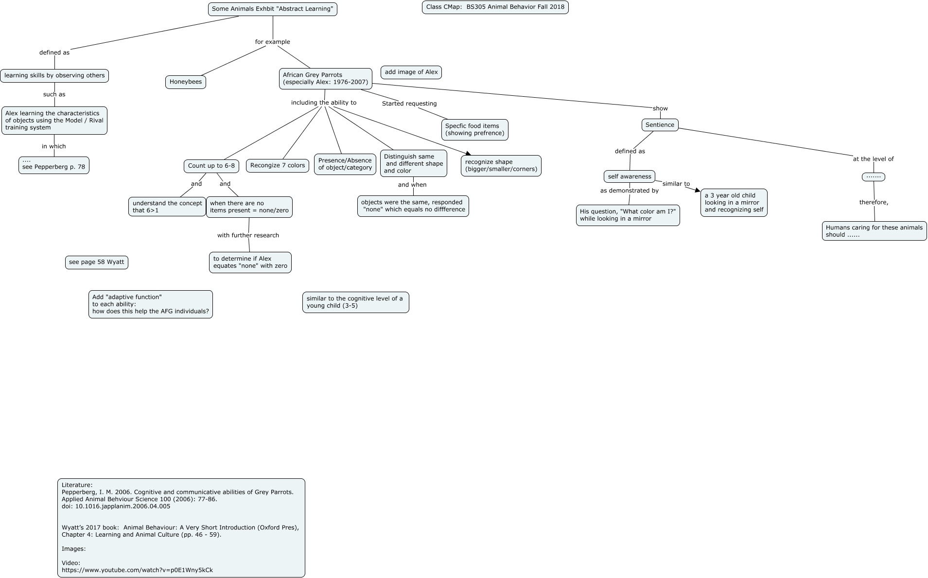 This Concept Map, created with IHMC CmapTools, has information related to: Abstract Learning (Alex and Honeybees) 101718, Count up to 6-8 and when there are no items present = none/zero, when there are no items present = none/zero with further research to determine if Alex equates "none" with zero, learning skills by observing others such as Alex learning the characteristics of objects using the Model / Rival training system, Sentience defined as self awareness, Count up to 6-8 and understand the concept that 6ɭ, ....... therefore, Humans caring for these animals should ......, African Grey Parrots (especially Alex: 1976-2007) show Sentience, African Grey Parrots (especially Alex: 1976-2007) including the ability to recognize shape (bigger/smaller/corners), African Grey Parrots (especially Alex: 1976-2007) including the ability to Presence/Absence of object/category, Some Animals Exhbit "Abstract Learning" for example Honeybees, Some Animals Exhbit "Abstract Learning" defined as learning skills by observing others, African Grey Parrots (especially Alex: 1976-2007) Started requesting Specfic food items (showing prefrence), African Grey Parrots (especially Alex: 1976-2007) including the ability to Distinguish same and different shape and color, self awareness as demonstrated by His question, "What color am I?" while looking in a mirror, self awareness similar to a 3 year old child looking in a mirror and recognizing self, Alex learning the characteristics of objects using the Model / Rival training system in which .... see Pepperberg p. 78, African Grey Parrots (especially Alex: 1976-2007) including the ability to Recongize 7 colors, African Grey Parrots (especially Alex: 1976-2007) including the ability to Count up to 6-8, Sentience at the level of ......., Distinguish same and different shape and color and when objects were the same, responded "none" which equals no diffference