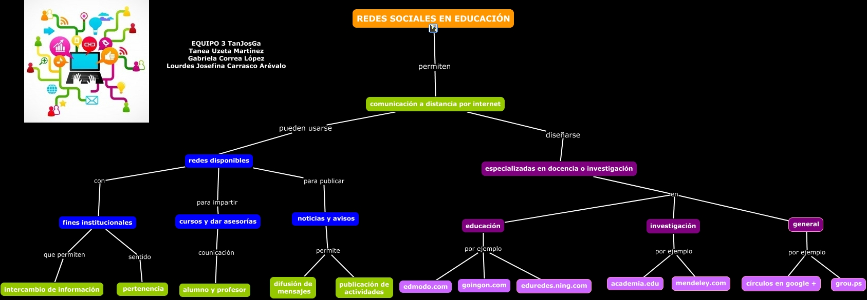 Este Cmap, tiene información relacionada con: uami_tanjosga, general por ejemplo grou.ps, fines institucionales que permiten intercambio de información, general por ejemplo círculos en google +, comunicación a distancia por internet diseñarse especializadas en docencia o investigación, educación por ejemplo eduredes.ning.com, educación por ejemplo edmodo.com, especializadas en docencia o investigación en educación, comunicación a distancia por internet pueden usarse redes disponibles, educación por ejemplo goingon.com, redes disponibles para impartir cursos y dar asesorías, redes disponibles con fines institucionales, investigación por ejemplo academia.edu, REDES SOCIALES EN EDUCACIÓN permiten comunicación a distancia por internet, noticias y avisos permite publicación de actividades, especializadas en docencia o investigación en investigación, fines institucionales sentido pertenencia, noticias y avisos permite difusión de mensajes, cursos y dar asesorías counicación alumno y profesor, redes disponibles para publicar noticias y avisos, especializadas en docencia o investigación en general