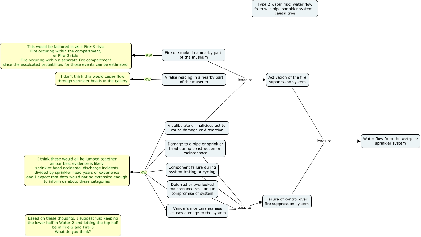 This Concept Map, created with IHMC CmapTools, has information related to: Cooney CPRAM 2 Water-2 RW notes 2020-06-25, Damage to a pipe or sprinkler head during construction or maintenance leads to Failure of control over fire suppression system, Vandalism or carelessness causes damage to the system leads to Failure of control over fire suppression system, A deliberate or malicious act to cause damage or distraction leads to Activation of the fire suppression system, A deliberate or malicious act to cause damage or distraction RW I think these would all be lumped together as our best evidence is likely sprinkler head accidental discharge incidents divided by sprinkler head years of experience and I expect that data would not be extensive enough to inform us about these categories, Failure of control over fire suppression system leads to Water flow from the wet-pipe sprinkler system, Component failure during system testing or cycling leads to Failure of control over fire suppression system, A false reading in a nearby part of the museum leads to Activation of the fire suppression system, Fire or smoke in a nearby part of the museum leads to Activation of the fire suppression system, Activation of the fire suppression system leads to Water flow from the wet-pipe sprinkler system, Fire or smoke in a nearby part of the museum RW This would be factored in as a Fire-3 risk: Fire occuring within the compartment, or Fire-2 risk: Fire occuring within a separate fire compartment since the assoicated probabilites for those events can be estimated, Deferred or overlooked maintenance resulting in compromise of system leads to Failure of control over fire suppression system, Component failure during system testing or cycling RW I think these would all be lumped together as our best evidence is likely sprinkler head accidental discharge incidents divided by sprinkler head years of experience and I expect that data would not be extensive enough to inform us about these categories, Damage to a pipe or sprinkler head during construction or maintenance RW I think these would all be lumped together as our best evidence is likely sprinkler head accidental discharge incidents divided by sprinkler head years of experience and I expect that data would not be extensive enough to inform us about these categories, A false reading in a nearby part of the museum RW I don't think this would cause flow through sprinkler heads in the gallery, Deferred or overlooked maintenance resulting in compromise of system RW I think these would all be lumped together as our best evidence is likely sprinkler head accidental discharge incidents divided by sprinkler head years of experience and I expect that data would not be extensive enough to inform us about these categories, Vandalism or carelessness causes damage to the system RW I think these would all be lumped together as our best evidence is likely sprinkler head accidental discharge incidents divided by sprinkler head years of experience and I expect that data would not be extensive enough to inform us about these categories
