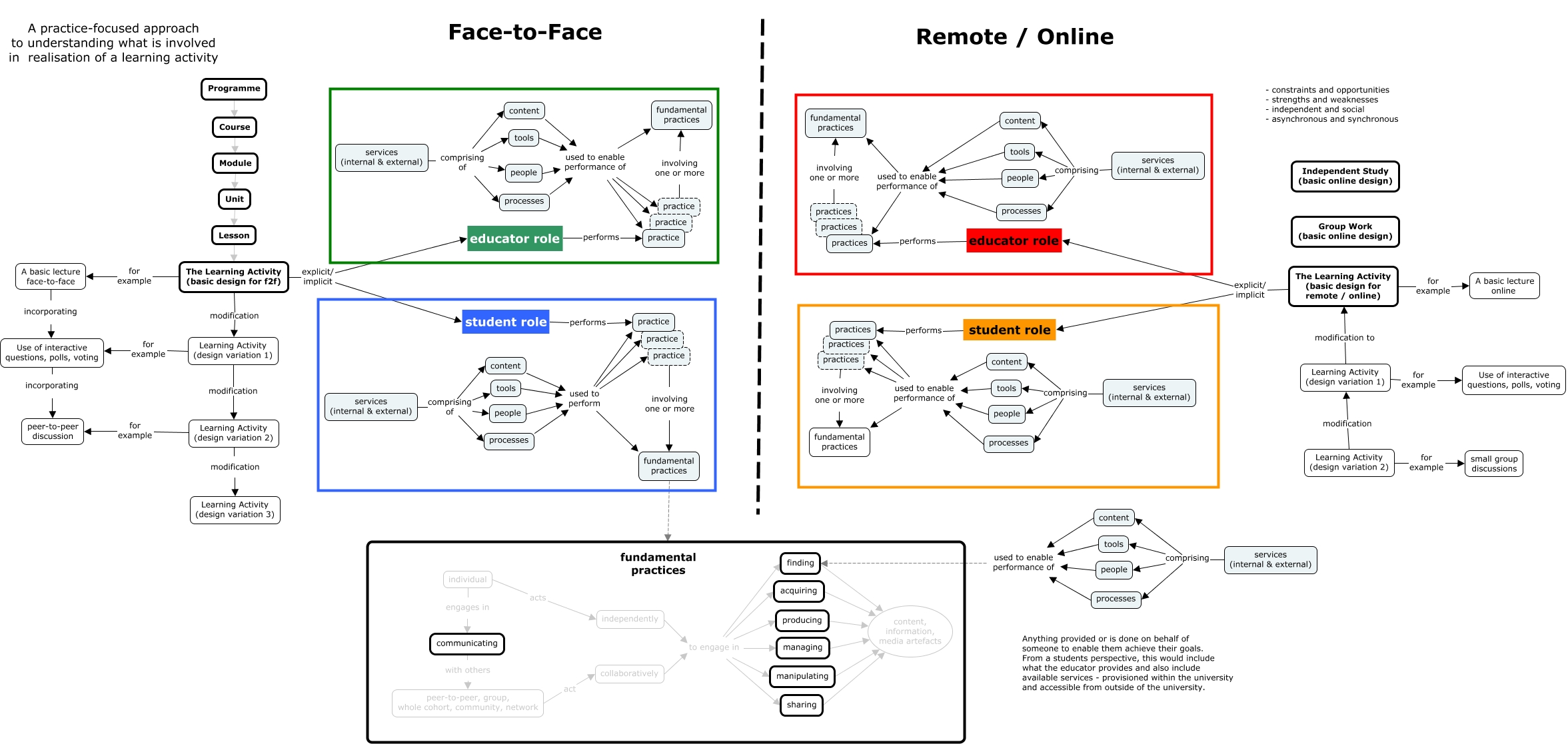 This Concept Map, created with IHMC CmapTools, has information related to: practice-focused - learning activity design, content used to enable performance of finding, services (internal & external) comprising people, tools used to enable performance of practice, services (internal & external) comprising tools, processes used to enable performance of finding, processes used to perform practice, processes used to enable performance of practices, tools used to enable performance of practices, peer-to-peer, group, whole cohort, community, network act collaboratively, collaboratively to engage in acquiring, educator role performs practices, tools used to enable performance of finding, services (internal & external) comprising of people, people used to enable performance of practices, people used to enable performance of practice, content used to enable performance of practices, services (internal & external) comprising tools, services (internal & external) comprising people,, A basic lecture face-to-face incorporating Use of interactive questions, polls, voting