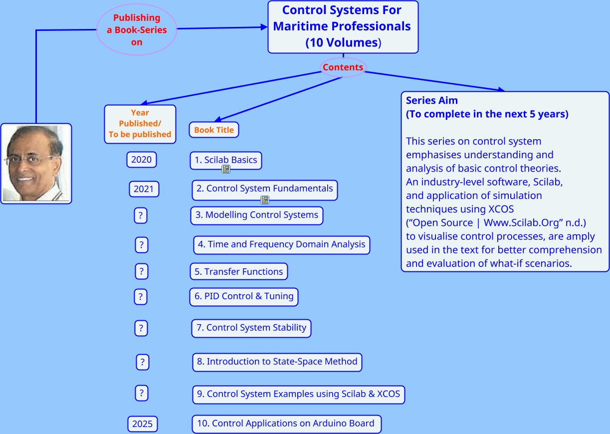 This Concept Map, created with IHMC CmapTools, has information related to: KC-Publications-Book_Series-on-Control-Systems, Control Systems For Maritime Professionals (10 Volumes) Contents Series Aim (To complete in the next 5 years) This series on control system emphasises understanding and analysis of basic control theories. An industry-level software, Scilab, and application of simulation techniques using XCOS (“Open Source | Www.Scilab.Org” n.d.) to visualise control processes, are amply used in the text for better comprehension and evaluation of what-if scenarios., Control Systems For Maritime Professionals (10 Volumes) Contents Book Title, Publishing a Book-Series on Control Systems For Maritime Professionals (10 Volumes), Control Systems For Maritime Professionals (10 Volumes) Contents Year Published/ To be published