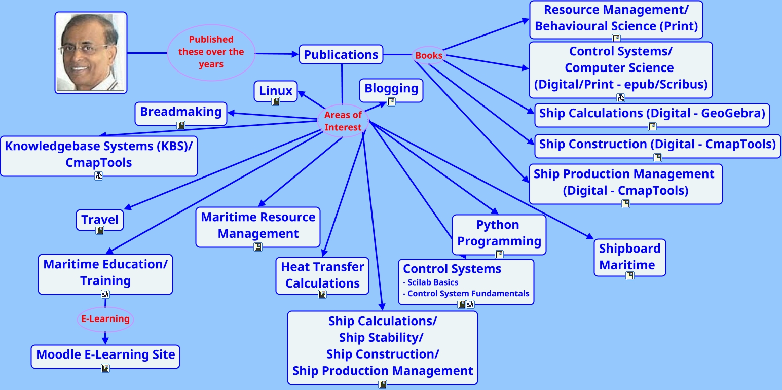 This Concept Map, created with IHMC CmapTools, has information related to: Kalyan_Chatterjea-Publications, Published these over the years Publications, Publications Areas of Interest Heat Transfer Calculations, Publications Areas of Interest Breadmaking, Publications Areas of Interest Control Systems - Scilab Basics - Control System Fundamentals, Publications Books Resource Management/ Behavioural Science (Print), Publications Books Ship Construction (Digital - CmapTools), Publications Books Ship Calculations (Digital - GeoGebra), Publications Areas of Interest Ship Calculations/ Ship Stability/ Ship Construction/ Ship Production Management, Publications Areas of Interest Blogging, Publications Areas of Interest Maritime Resource Management, Publications Areas of Interest Shipboard Maritime, Publications Areas of Interest Linux, Maritime Education/ Training E-Learning Moodle E-Learning Site, Publications Areas of Interest Knowledgebase Systems (KBS)/ CmapTools, Publications Areas of Interest Travel, Publications Books Ship Production Management (Digital - CmapTools), Publications Areas of Interest Python Programming, Publications Areas of Interest Maritime Education/ Training, Publications Books Control Systems/ Computer Science (Digital/Print - epub/Scribus)