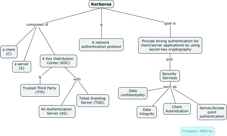 Este Cmap, tiene información relacionada con: Kerberos, Kerberos is A network authentication protocol, Provide strong authentication for client/server applications by using secret-key cryptography and Security Services, Kerberos goal is Provide strong authentication for client/server applications by using secret-key cryptography, A Key Distribution Center (KDC) with Ticket Granting Server (TGS)., Security Services such as Data Integrity, Security Services such as Data confidentiality, A Key Distribution Center (KDC) with An Authentication Server (AS), Security Services such as Client Autentication, A Key Distribution Center (KDC) is Trusted Third Party (TTP), Kerberos composed of a client (C), Kerberos composed of a server (S), Security Services such as Server/Access point authentication, Kerberos composed of A Key Distribution Center (KDC)