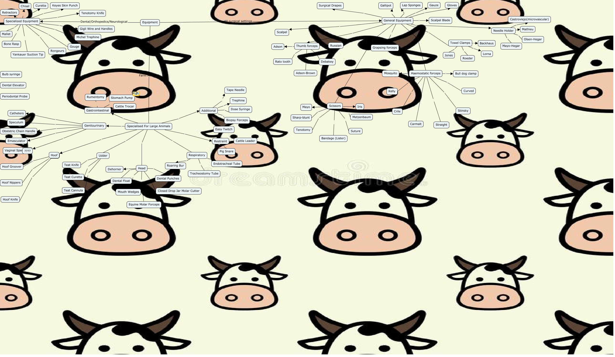 This Concept Map, created with IHMC CmapTools, has information related to: Equipment Surgery, Respiratory Tracheostomy Tube, Gastrointestinal Stomach Pump, Equipment Farm Animals Specialised For Large Animals, Towel Clamps Lorna, Udder Teat Knife, General Equipment Grapsing forceps, Haemostatic forceps Kelly, Additional Tape Needle, Specialised For Large Animals Additional, Scissors Metzenbaum, General Equipment Gloves, Needle Holder Mathieu, Thumb forceps Adson, Specialised For Large Animals Genitourinary, Head Dental Punches, Towel Clamps Jones, Specialized Equipment Keyes Skin Punch, Thumb forceps Adson-Brown, Specialized Equipment Retractors, General Equipment Towel Clamps