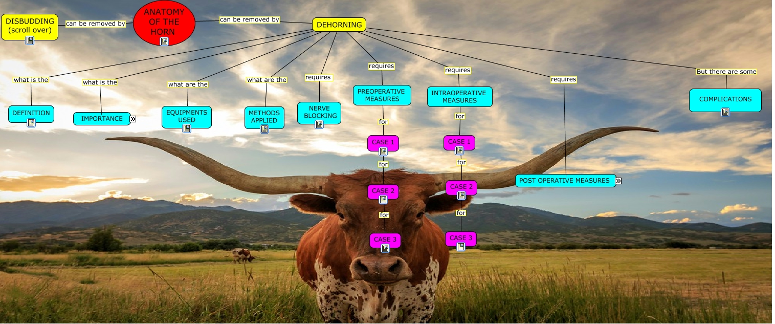 This Concept Map, created with IHMC CmapTools, has information related to: GROUP E LAB 2 (DEHORNING), CASE 1 for CASE 2, DEHORNING requires POSTOPERATIVE MEASURES, INTRAOPERATIVE MEASURES for CASE 1, DEHORNING what are the METHODS APPLIED, DEHORNING what are the EQUIPMENTS USED, PREOPERATIVE MEASURES for CASE 1, MONITORING entails POSTOPERATIVE MEASURES, DEHORNING can be removed by ANATOMY OF THE HORN, DEHORNING requires NERVE BLOCKING, DEHORNING requires PREOPERATIVE MEASURES, IMPORTANCE entails MANAGEMENT (scroll over), COMPLICATIONS But there are some DEHORNING, WITHDRAWAL TIME (scroll over) entails POSTOPERATIVE MEASURES, CASE 1 for CASE 2, DEHORNING requires INTRAOPERATIVE MEASURES, CASE 2 for CASE 3, CASE 2 for CASE 3, DEHORNING what is the DEFINITION, DEHORNING what is the IMPORTANCE, POSTOPERATIVE MEASURES entails POSTOPERATIVE CARE