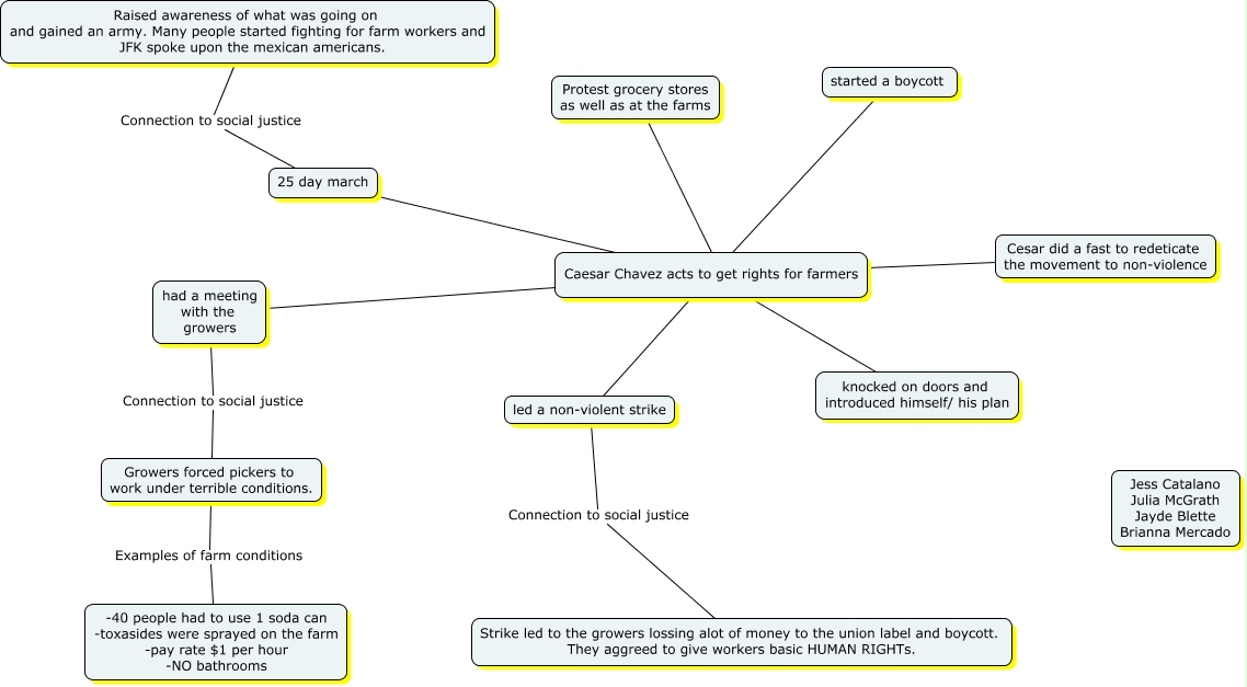 This Concept Map, created with IHMC CmapTools, has information related to: Breakout Room 4, Caesar Chavez acts to get rights for farmers led a non-violent strike, Caesar Chavez acts to get rights for farmers had a meeting with the growers, Protest grocery stores as well as at the farms Caesar Chavez acts to get rights for farmers, 25 day march Caesar Chavez acts to get rights for farmers, Caesar Chavez acts to get rights for farmers started a boycott, Caesar Chavez acts to get rights for farmers Cesar did a fast to redeticate the movement to non-violence, Caesar Chavez acts to get rights for farmers knocked on doors and introduced himself/ his plan, 25 day march Connection to social justice Raised awareness of what was going on and gained an army. Many people started fighting for farm workers and JFK spoke upon the mexican americans., had a meeting with the growers Connection to social justice Growers forced pickers to work under terrible conditions., led a non-violent strike Connection to social justice Strike led to the growers lossing alot of money to the union label and boycott. They aggreed to give workers basic HUMAN RIGHTs., Growers forced pickers to work under terrible conditions. Examples of farm conditions -40 people had to use 1 soda can -toxasides were sprayed on the farm -pay rate $1 per hour -NO bathrooms
