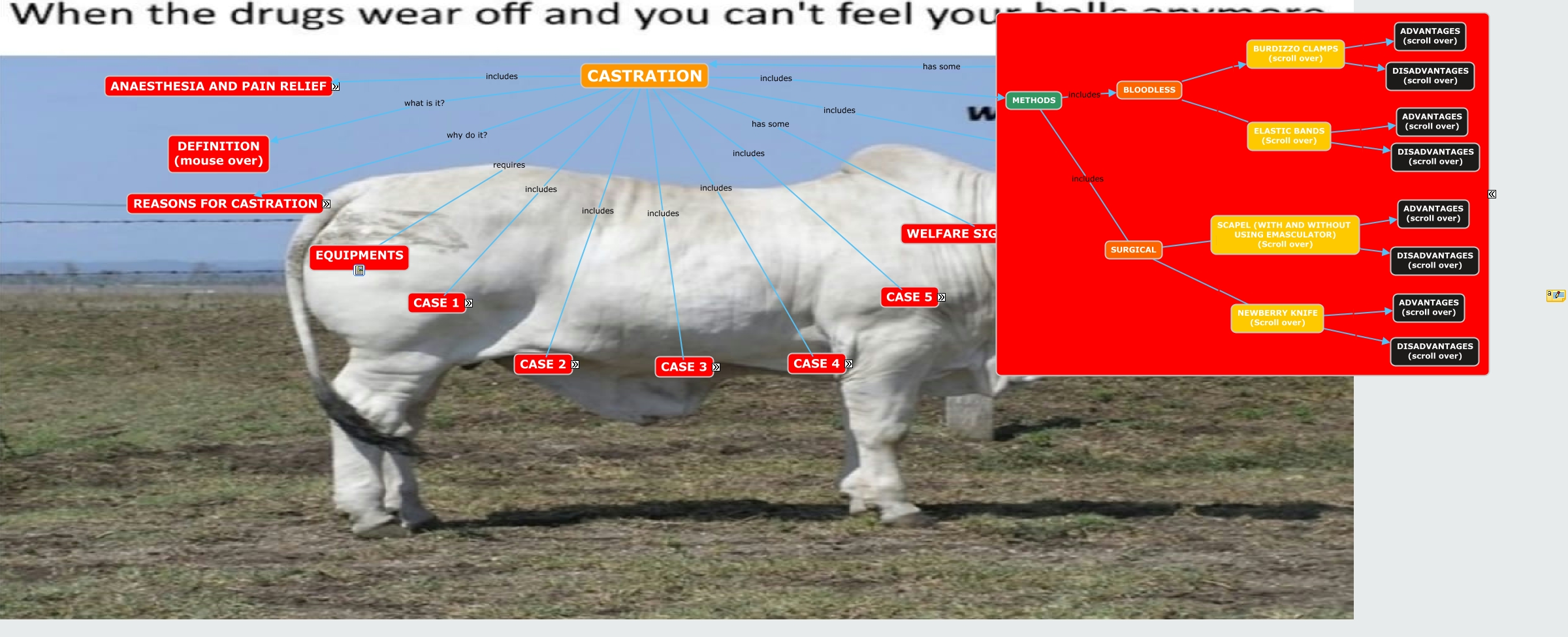 This Concept Map, created with IHMC CmapTools, has information related to: GROUP E LAB 4, WELFARE SIGNIFICANCE includes Local anaesthesia eliminates pain caused by rubber ring or latex band castration, SCAPEL (WITH AND WITHOUT USING EMASCULATOR) (Scroll over) ADVANTAGES (scroll over), CASTRATION includes DRUGS, ELASTIC BANDS (Scroll over) DISADVANTAGES (scroll over), REASONS FOR CASTRATING includes To stop the production of male hormones and semen, REASONS FOR CASTRATING includes To allow for increased market value due to increase tenderness and marbling of meat, CASTRATION includes CASE 5 (scroll over), CASTRATION has some WELFARE SIGNIFICANCE, CASE 4 requires POSTOPERATIVE MEASURES, SCAPEL (WITH AND WITHOUT USING EMASCULATOR) (Scroll over) DISADVANTAGES (scroll over), CASTRATION includes CASE 1, CASTRATION includes CASE 2, REASONS FOR CASTRATING includes To prevent mating and reproduction after puberty, CASTRATION what is it? DEFINITION (mouse over), CASE 3 requires POSTPERATIVE MEASURES, CASE 2 requires RESTRAINT (Scroll over), CASE 2 requires PREOPERATIVE MEASURES (Scroll over), CASE 1 requires RESTRAINT, CASE 1 requires POSTOPERATIVE MEASURES, CASE 2 requires POSTOPERATIVE MEASURES (Scroll over)