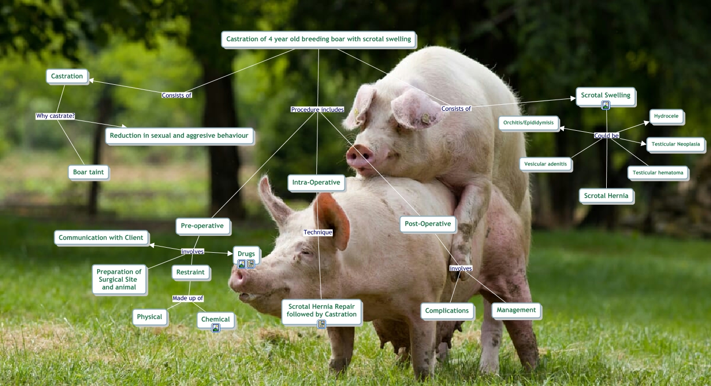 This Concept Map, created with IHMC CmapTools, has information related to: Castration of Breeding Boar, Pre-operative involves Communication with Client, Castration of 4 year old breeding boar with scrotal swelling Consists of Scrotal Swelling, Post-Operative involves Management, Scrotal Swelling Could be Orchitis/Epididymisis, Castration of 4 year old breeding boar with scrotal swelling Procedure includes Post-Operative, Intra-Operative Technique Scrotal Hernia Repair followed by Castration, Castration Why castrate? Reduction in sexual and aggresive behaviour, Post-Operative involves Complications, Scrotal Swelling Could be Scrotal Hernia, Castration of 4 year old breeding boar with scrotal swelling Procedure includes Intra-Operative, Castration Why castrate? Boar taint, Scrotal Swelling Could be Testicular hematoma, Scrotal Swelling Could be Hydrocele, Pre-operative involves Preparation of Surgical Site and animal, Scrotal Swelling Could be Vesicular adenitis, Castration of 4 year old breeding boar with scrotal swelling Procedure includes Pre-operative, Restraint Made up of Chemical, Castration of 4 year old breeding boar with scrotal swelling Consists of Castration, Pre-operative involves Drugs, Restraint Made up of Physical