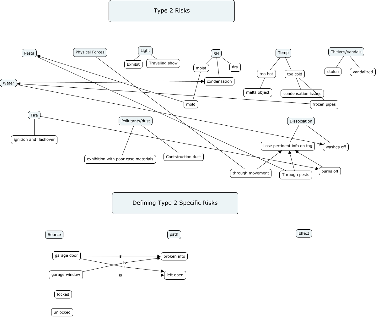 This Concept Map, created with IHMC CmapTools, has information related to: MelissaKing_Type2SpecificRisks, garage window is broken into, burns off Lose pertinent info on tag, too cold condensation issues, Dissociation Lose pertinent info on tag, garage door is left open, Pollutants/dust Contstruction dust, Theives/vandals stolen, moist mold, too hot melts object, Water washes off, Pollutants/dust exhibition with poor case materials, Fire burns off, mold Pests, garage door is broken into, Through pests Lose pertinent info on tag, through movement Lose pertinent info on tag, Light Exhibit, Temp too cold, Theives/vandals vandalized, Pests Through pests