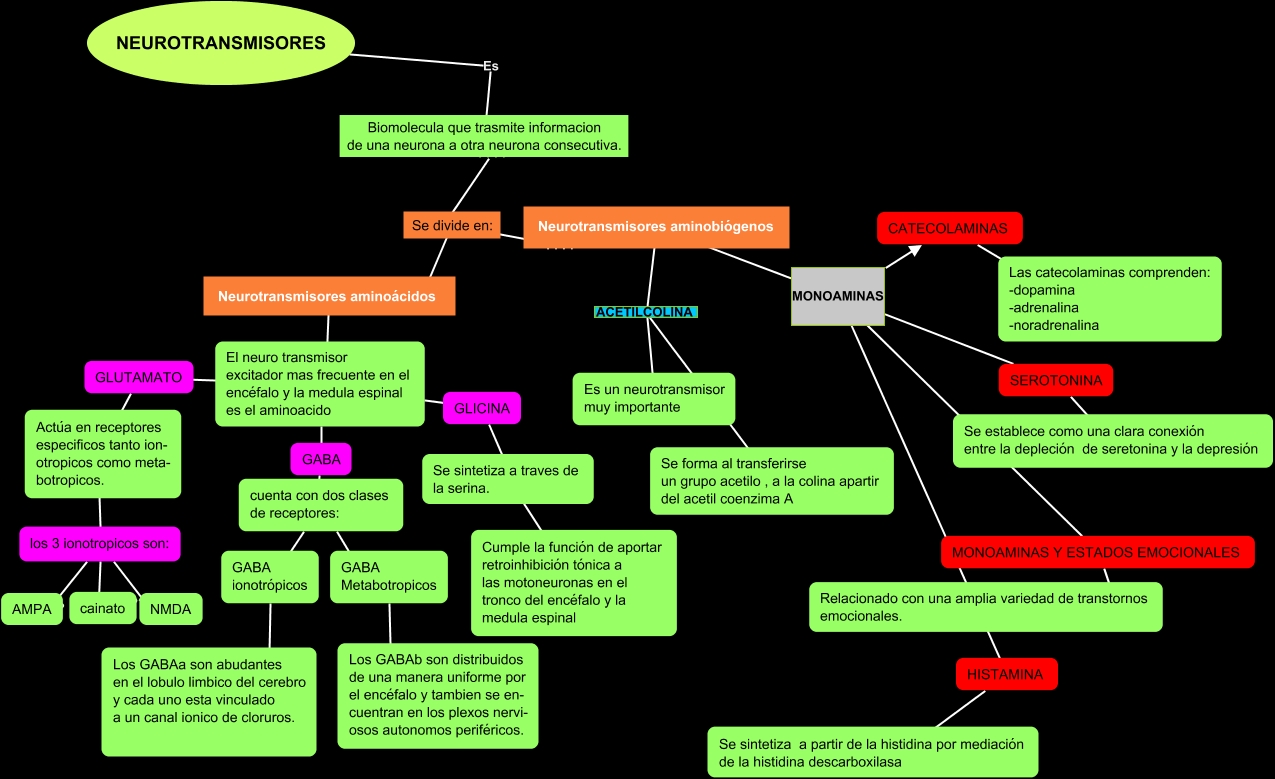 Este Cmap, tiene información relacionada con: Clau1, los 3 ionotropicos son: ???? AMPA, Se sintetiza a traves de la serina. ???? Cumple la función de aportar retroinhibición tónica a las motoneuronas en el tronco del encéfalo y la medula espinal, Se divide en: ???? Neurotransmisores aminobiógenos, NEUROTRANSMISORES Es Biomolecula que trasmite informacion de una neurona a otra neurona consecutiva., Actúa en receptores especificos tanto ion- otropicos como meta- botropicos. ???? los 3 ionotropicos son:, cuenta con dos clases de receptores: ???? GABA Metabotropicos, GABA Metabotropicos ???? Los GABAb son distribuidos de una manera uniforme por el encéfalo y tambien se en- cuentran en los plexos nervi- osos autonomos periféricos., Neurotransmisores aminobiógenos MONOAMINAS CATECOLAMINAS, GABA ???? cuenta con dos clases de receptores:, GLICINA ???? Se sintetiza a traves de la serina., los 3 ionotropicos son: ???? NMDA, CATECOLAMINAS ???? Las catecolaminas comprenden: -dopamina -adrenalina -noradrenalina, Neurotransmisores aminobiógenos MONOAMINAS MONOAMINAS Y ESTADOS EMOCIONALES, los 3 ionotropicos son: ???? cainato, GABA ionotrópicos ???? Los GABAa son abudantes en el lobulo limbico del cerebro y cada uno esta vinculado a un canal ionico de cloruros., Biomolecula que trasmite informacion de una neurona a otra neurona consecutiva. ???? Se divide en:, Neurotransmisores aminobiógenos ACETILCOLINA Se forma al transferirse un grupo acetilo , a la colina apartir del acetil coenzima A, El neuro transmisor excitador mas frecuente en el encéfalo y la medula espinal es el aminoacido ???? GLUTAMATO, Se divide en: ???? Neurotransmisores aminoácidos, cuenta con dos clases de receptores: ???? GABA ionotrópicos
