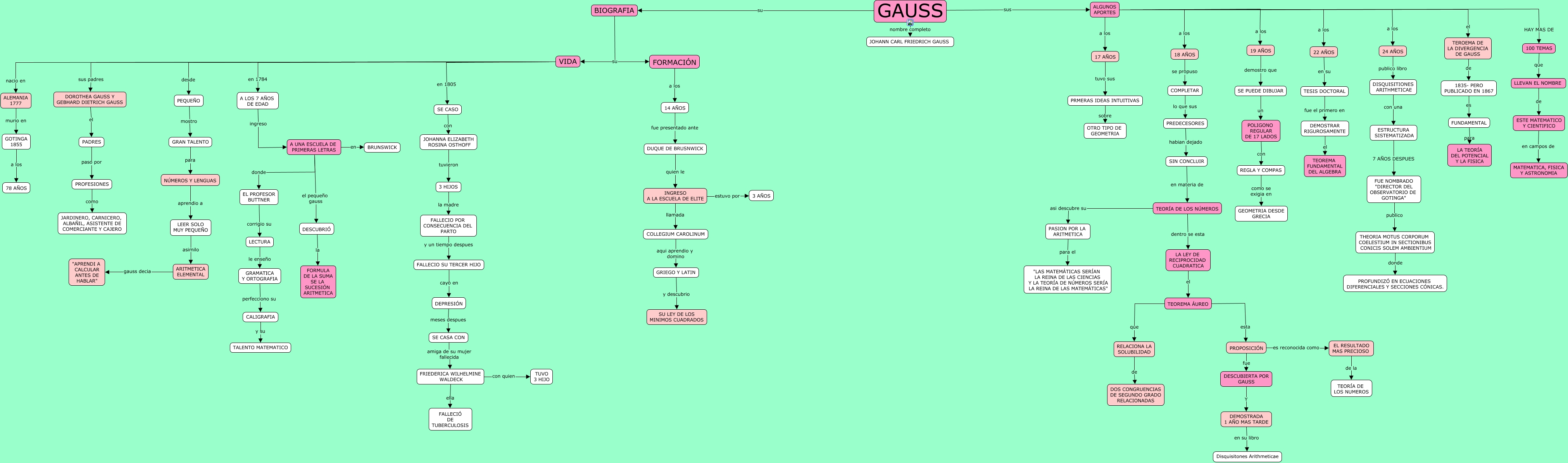Este Cmap, tiene información relacionada con: GAUSS, EL PROFESOR BUTTNER corrigio su LECTURA, FRIEDERICA WILHELMINE WALDECK ella FALLECIÓ DE TUBERCULOSIS, SE CASO con JOHANNA ELIZABETH ROSINA OSTHOFF, JOHANNA ELIZABETH ROSINA OSTHOFF tuvieron 3 HIJOS, ALGUNOS APORTES a los 17 AÑOS, LA LEY DE RECIPROCIDAD CUADRATICA el TEOREMA ÁUREO, COLLEGIUM CAROLINUM aqui aprendio y domino GRIEGO Y LATIN, GAUSS sus ALGUNOS APORTES, 100 TEMAS que LLEVAN EL NOMBRE, GRAMATICA Y ORTOGRAFIA perfecciono su CALIGRAFIA, FUE NOMBRADO "DIRECTOR DEL OBSERVATORIO DE GOTINGA" publico THEORIA MOTUS CORPORUM COELESTIUM IN SECTIONIBUS CONICIS SOLEM AMBIENTIUM, A LOS 7 AÑOS DE EDAD ingreso A UNA ESCUELA DE PRIMERAS LETRAS, THEORIA MOTUS CORPORUM COELESTIUM IN SECTIONIBUS CONICIS SOLEM AMBIENTIUM donde PROFUNDIZÓ EN ECUACIONES DIFERENCIALES Y SECCIONES CÓNICAS., GRIEGO Y LATIN y descubrio SU LEY DE LOS MINIMOS CUADRADOS, ESTRUCTURA SISTEMATIZADA 7 AÑOS DESPUES FUE NOMBRADO "DIRECTOR DEL OBSERVATORIO DE GOTINGA", POLIGONO REGULAR DE 17 LADOS con REGLA Y COMPAS, FRIEDERICA WILHELMINE WALDECK con quien TUVO 3 HIJO, ALGUNOS APORTES a los 24 AÑOS, GAUSS su BIOGRAFIA, LECTURA le enseño GRAMATICA Y ORTOGRAFIA