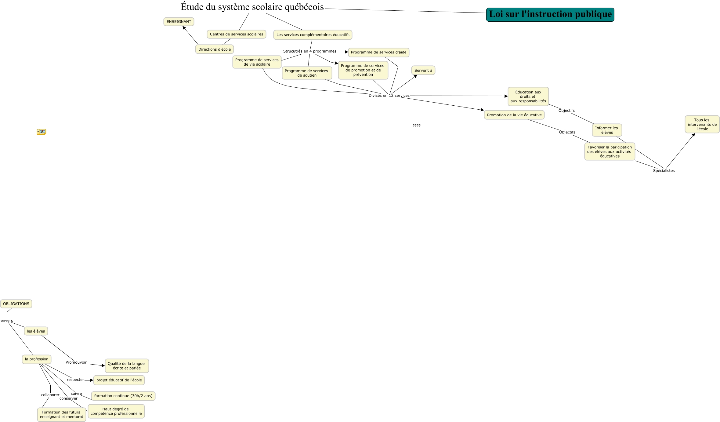 Cette carte de concepts créée avec IHMC CmapTools traite de: Services_complémentaires_Rémillard_Sauvé, Centres de services scolaires ???? Directions d'école, Programme de services d'aide Divisés en 12 services Promotion de la vie éducative, Les services complémentaires éducatifs Strucutrés en 4 programmes Programme de services de promotion et de prévention, Directions d'école ???? ENSEIGNANT, Promotion de la vie éducative Objectifs Favoriser la paricipation des élèves aux activités éducatives, les élèves Promouvoir Qualité de la langue écrite et parlée, Programme de services de soutien Divisés en 12 services Promotion de la vie éducative, OBLIGATIONS envers les élèves, Informer les élèves Spécialistes Tous les intervenants de l'école, OBLIGATIONS envers la profession, Les services complémentaires éducatifs Strucutrés en 4 programmes Programme de services de soutien, la profession conserver Haut degré de compétence professionnelle, la profession collaborer Formation des futurs enseignant et mentorat, Programme de services de vie scolaire Divisés en 12 services Promotion de la vie éducative, Les services complémentaires éducatifs Étude du système scolaire québécois Centres de services scolaires, Éducation aux droits et aux responsabilités Objectifs Informer les élèves, Les services complémentaires éducatifs Strucutrés en 4 programmes Programme de services d'aide, Programme de services de vie scolaire Divisés en 12 services Éducation aux droits et aux responsabilités, Programme de services de vie scolaire Divisés en 12 services Servent à, Programme de services d'aide Divisés en 12 services Servent à