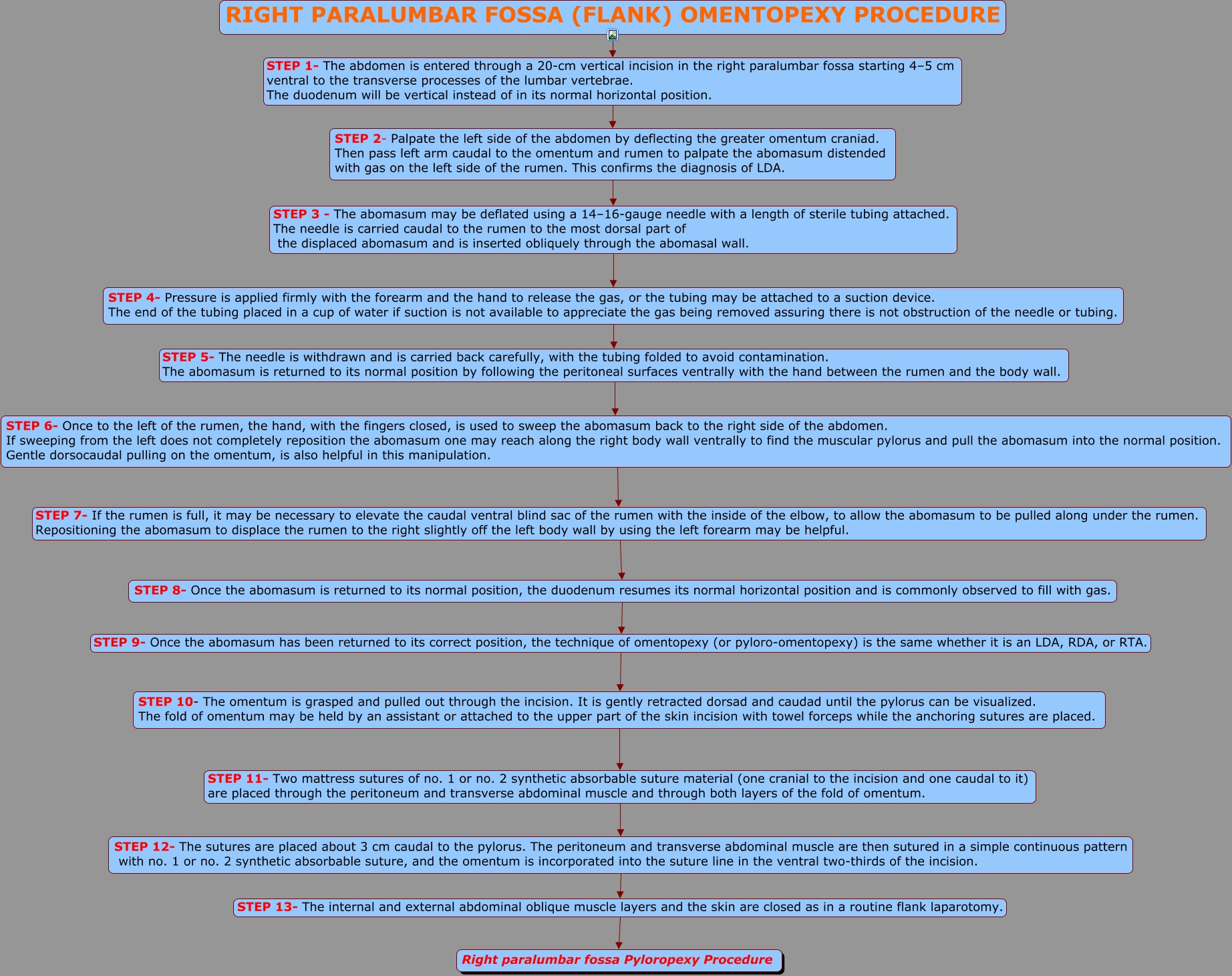 This Concept Map, created with IHMC CmapTools, has information related to: Right Flank Omentopexy procedure, STEP 8- Once the abomasum is returned to its normal position, the duodenum resumes its normal horizontal position and is commonly observed to fill with gas. STEP 9- Once the abomasum has been returned to its correct position, the technique of omentopexy (or pyloro-omentopexy) is the same whether it is an LDA, RDA, or RTA. STEP 10- The omentum is grasped and pulled out through the incision. It is gently retracted dorsad and caudad until the pylorus can be visualized. The fold of omentum may be held by an assistant or attached to the upper part of the skin incision with towel forceps while the anchoring sutures are placed., STEP 6- Once to the left of the rumen, the hand, with the fingers closed, is used to sweep the abomasum back to the right side of the abdomen. If sweeping from the left does not completely reposition the abomasum one may reach along the right body wall ventrally to find the muscular pylorus and pull the abomasum into the normal position. Gentle dorsocaudal pulling on the omentum, is also helpful in this manipulation. STEP 7- If the rumen is full, it may be necessary to elevate the caudal ventral blind sac of the rumen with the inside of the elbow, to allow the abomasum to be pulled along under the rumen. Repositioning the abomasum to displace the rumen to the right slightly off the left body wall by using the left forearm may be helpful. STEP 8- Once the abomasum is returned to its normal position, the duodenum resumes its normal horizontal position and is commonly observed to fill with gas., STEP 10- The omentum is grasped and pulled out through the incision. It is gently retracted dorsad and caudad until the pylorus can be visualized. The fold of omentum may be held by an assistant or attached to the upper part of the skin incision with towel forceps while the anchoring sutures are placed. STEP 11- Two mattress sutures of no. 1 or no. 2 synthetic absorbable suture material (one cranial to the incision and one caudal to it) are placed through the peritoneum and transverse abdominal muscle and through both layers of the fold of omentum. STEP 12- The sutures are placed about 3 cm caudal to the pylorus. The peritoneum and transverse abdominal muscle are then sutured in a simple continuous pattern with no. 1 or no. 2 synthetic absorbable suture, and the omentum is incorporated into the suture line in the ventral two-thirds of the incision., STEP 4- Pressure is applied firmly with the forearm and the hand to release the gas, or the tubing may be attached to a suction device. The end of the tubing placed in a cup of water if suction is not available to appreciate the gas being removed assuring there is not obstruction of the needle or tubing. STEP 5- The needle is withdrawn and is carried back carefully, with the tubing folded to avoid contamination. The abomasum is returned to its normal position by following the peritoneal surfaces ventrally with the hand between the rumen and the body wall. STEP 6- Once to the left of the rumen, the hand, with the fingers closed, is used to sweep the abomasum back to the right side of the abdomen. If sweeping from the left does not completely reposition the abomasum one may reach along the right body wall ventrally to find the muscular pylorus and pull the abomasum into the normal position. Gentle dorsocaudal pulling on the omentum, is also helpful in this manipulation., RIGHT PARALUMBAR FOSSA (FLANK) OMENTOPEXY PROCEDURE STEP 1- The abdomen is entered through a 20-cm vertical incision in the right paralumbar fossa starting 4–5 cm ventral to the transverse processes of the lumbar vertebrae. The duodenum will be vertical instead of in its normal horizontal position. STEP 2- Palpate the left side of the abdomen by deflecting the greater omentum craniad. Then pass left arm caudal to the omentum and rumen to palpate the abomasum distended with gas on the left side of the rumen. This confirms the diagnosis of LDA., STEP 2- Palpate the left side of the abdomen by deflecting the greater omentum craniad. Then pass left arm caudal to the omentum and rumen to palpate the abomasum distended with gas on the left side of the rumen. This confirms the diagnosis of LDA. STEP 3 - The abomasum may be deflated using a 14–16-gauge needle with a length of sterile tubing attached. The needle is carried caudal to the rumen to the most dorsal part of the displaced abomasum and is inserted obliquely through the abomasal wall. STEP 4- Pressure is applied firmly with the forearm and the hand to release the gas, or the tubing may be attached to a suction device. The end of the tubing placed in a cup of water if suction is not available to appreciate the gas being removed assuring there is not obstruction of the needle or tubing., STEP 12- The sutures are placed about 3 cm caudal to the pylorus. The peritoneum and transverse abdominal muscle are then sutured in a simple continuous pattern with no. 1 or no. 2 synthetic absorbable suture, and the omentum is incorporated into the suture line in the ventral two-thirds of the incision. STEP 13- The internal and external abdominal oblique muscle layers and the skin are closed as in a routine flank laparotomy. Right paralumbar fossa Pyloropexy Procedure