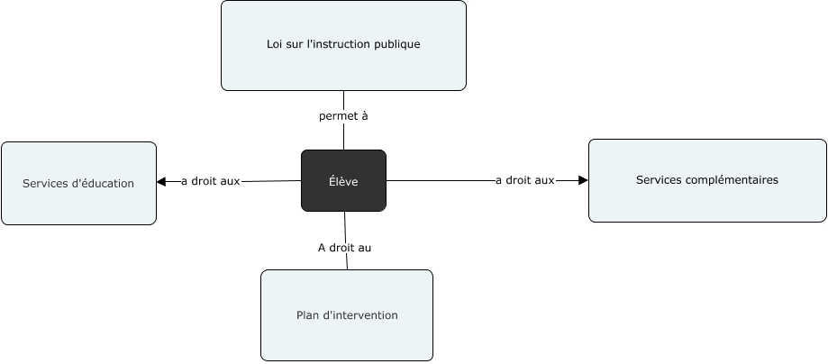 Cette carte de concepts créée avec IHMC CmapTools traite de: TP3, Élève a droit aux Services d'éducation, Élève a droit aux Services complémentaires, Loi sur l'instruction publique permet à Élève, Élève A droit au Plan d'intervention