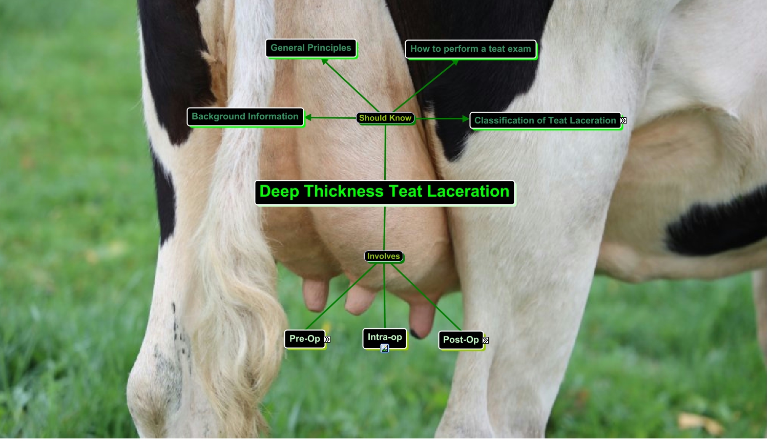 This Concept Map, created with IHMC CmapTools, has information related to: Teat Laceration in a Dairy Cow, Deep Thickness Teat Laceration Involves Post-Op, Deep Thickness Teat Laceration Should Know How to perform a teat exam, Pre-op Consists of: Vet-farmer communication, Classification of Teat Laceration Consists of Laceration Depth, Classification of Teat Laceration Consists of Localization and Conformation of the Laceration, Post-op Consists of: Farmer-vet communication, Classification of Teat Laceration Consists of Duration from time to trauma, Post-op Consists of: Drugs, Deep Thickness Teat Laceration Should Know Classification of Teat Laceration, Pre-op Consists of: Blocks, Pre-op Consists of: Drugs, Deep Thickness Teat Laceration Involves Pre-Op, Deep Thickness Teat Laceration Involves Intra-op, Deep Thickness Teat Laceration Should Know General Principles, Pre-op Consists of: Equipment, Classification of Teat Laceration Consists of Type of Laceration, Pre-op Consists of: Restraint, Post-op Consists of: Complications, Post-op Consists of: Observations, Pre-op Consists of: Area Prep