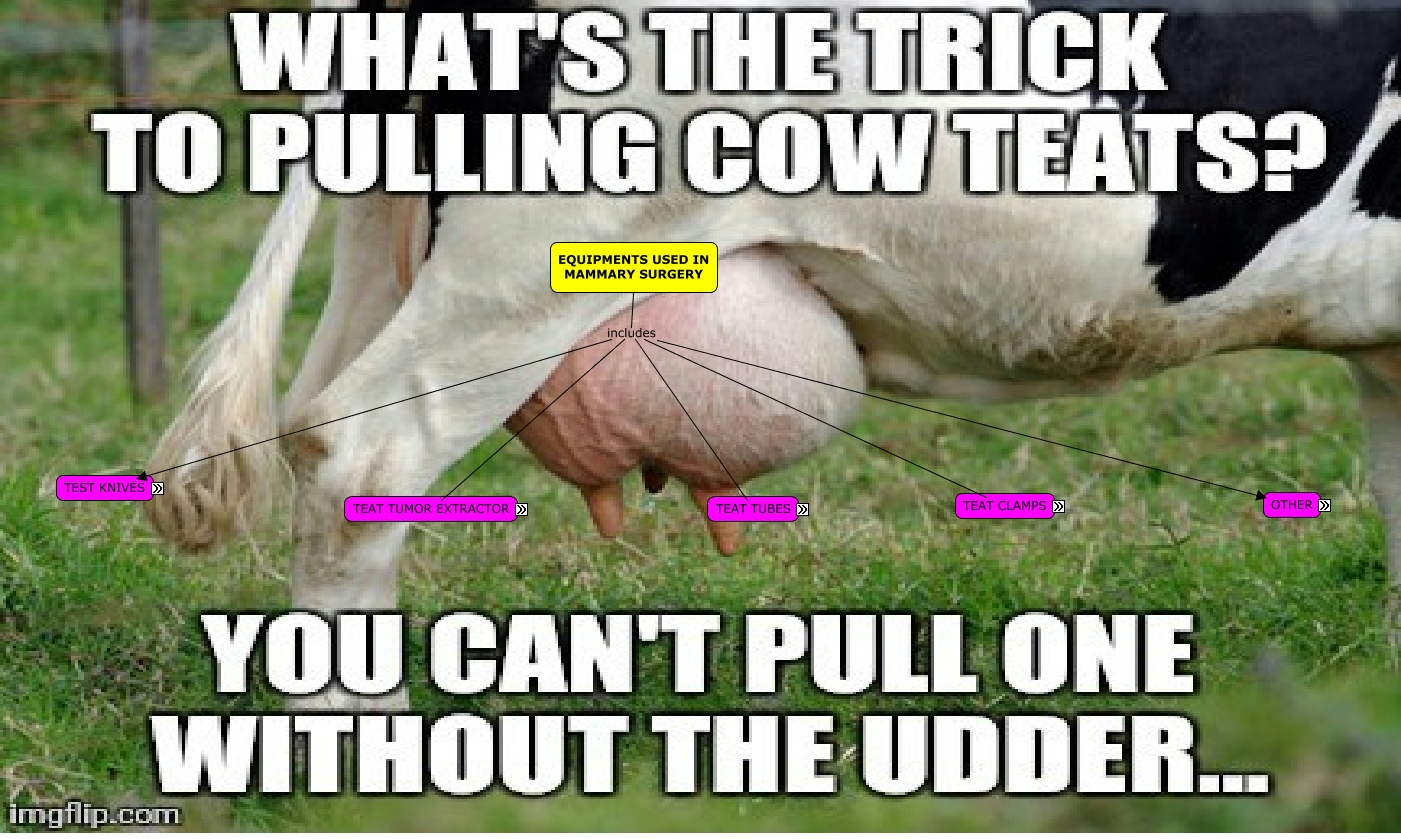This Concept Map, created with IHMC CmapTools, has information related to: Mammary Surgery equipment, Other include Teat cannula (scroll over), Teat Tubes (scroll over) consists of Dr. Larson's Self- Retaining Teat tube, EQUIPMENTS USED IN MAMMARY SURGERY includes Teat tumor extractor (scroll over), Test Knives (scroll over) Litchy Teat Knife, EQUIPMENTS USED IN MAMMARY SURGERY includes Other, Teat tumor extractor (scroll over) consists of Hugs Tumour extractor (scroll over), EQUIPMENTS USED IN MAMMARY SURGERY includes Test Knives (scroll over), EQUIPMENTS USED IN MAMMARY SURGERY includes Teat clamps (scroll over), Teat clamps (scroll over) consists of Fluid clamp, Test Knives (scroll over) Teat Bistoury (scroll over), Other include Teat dipper (scroll over), Other include Aligator forceps (scroll over), Teat clamps (scroll over) consists of Doyen clamp, EQUIPMENTS USED IN MAMMARY SURGERY includes Teat Tubes (scroll over), Teat tumor extractor (scroll over) consists of Cornell Teat Curette (scroll over), Test Knives (scroll over) Teat slitter (scroll over), Test Knives (scroll over) Hugs Teat Knife