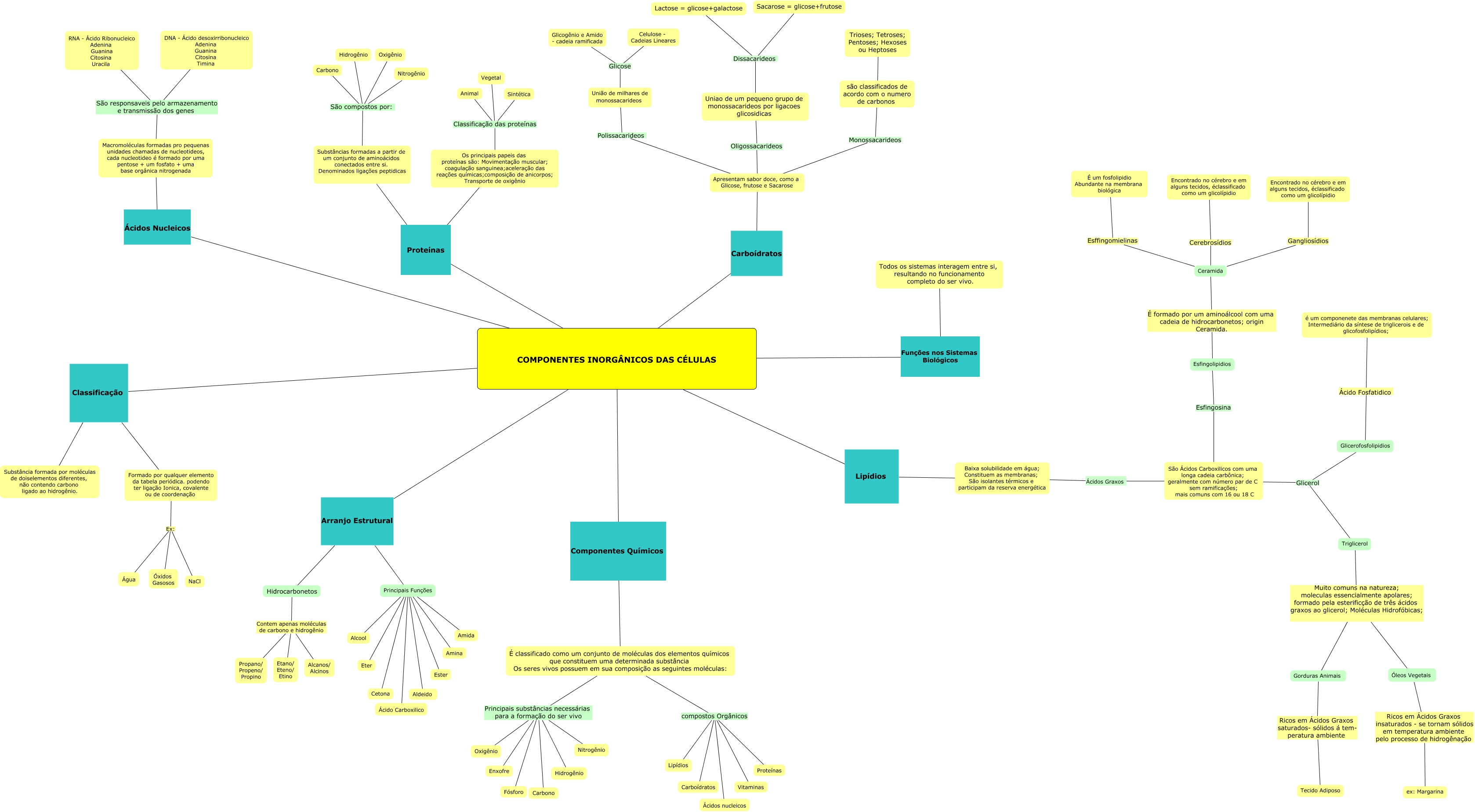 Esse mapa conceitual, produzido no IHMC CmapTools, tem a informação relacionada a: Mapa conceitual 2 - Gabriela Hortmann Campagnoli, Principais Funções Alcool Ácido Carboxilico, Formado por qualquer elemento da tabela periódica. podendo ter ligação Ionica, covalente ou de coordenação Ex: NaCl, Os principais papeis das proteínas são: Movimentação muscular; coagulação sanguinea;aceleração das reações químicas;composição de anicorpos; Transporte de oxigênio Classificação das proteínas Sintética, Hidrocarbonetos Contem apenas moléculas de carbono e hidrogênio Propano/ Propeno/ Propino, É classificado como um conjunto de moléculas dos elementos químicos que constituem uma determinada substância Os seres vivos possuem em sua composição as seguintes moléculas: Principais substâncias necessárias para a formação do ser vivo Oxigênio, É classificado como um conjunto de moléculas dos elementos químicos que constituem uma determinada substância Os seres vivos possuem em sua composição as seguintes moléculas: compostos Orgânicos Lipídios, Apresentam sabor doce, como a Glicose, frutose e Sacarose Oligossacarideos Uniao de um pequeno grupo de monossacarideos por ligacoes glicosidicas, COMPONENTES INORGÂNICOS DAS CÉLULAS Arranjo Estrutural Hidrocarbonetos, Formado por qualquer elemento da tabela periódica. podendo ter ligação Ionica, covalente ou de coordenação Ex: Óxidos Gasosos, Macromoléculas formadas pro pequenas unidades chamadas de nucleotideos, cada nucleotideo é formado por uma pentose + um fosfato + uma base orgânica nitrogenada São responsaveis pelo armazenamento e transmissão dos genes RNA - Ácido Ribonucleico Adenina Guanina Citosina Uracila, Glicerofosfolipidios Ácido Fosfatidico é um componenete das membranas celulares; Intermediário da síntese de triglicerois e de glicofosfolipídios;, União de milhares de monossacarideos Glicose Glicogênio e Amido - cadeia ramificada, COMPONENTES INORGÂNICOS DAS CÉLULAS Lipídios Baixa solubilidade em água; Constituem as membranas; São isolantes térmicos e participam da reserva energética, Principais Funções Alcool Aldeido, Triglicerol Muito comuns na natureza; moleculas essencialmente apolares; formado pela esterificção de três ácidos graxos ao glicerol; Moléculas Hidrofóbicas; Gorduras Animais, COMPONENTES INORGÂNICOS DAS CÉLULAS Proteínas Os principais papeis das proteínas são: Movimentação muscular; coagulação sanguinea;aceleração das reações químicas;composição de anicorpos; Transporte de oxigênio, É classificado como um conjunto de moléculas dos elementos químicos que constituem uma determinada substância Os seres vivos possuem em sua composição as seguintes moléculas: compostos Orgânicos Ácidos nucleicos, Principais Funções Alcool Amida, COMPONENTES INORGÂNICOS DAS CÉLULAS Arranjo Estrutural Principais Funções, Apresentam sabor doce, como a Glicose, frutose e Sacarose Monossacarideos são classificados de acordo com o numero de carbonos