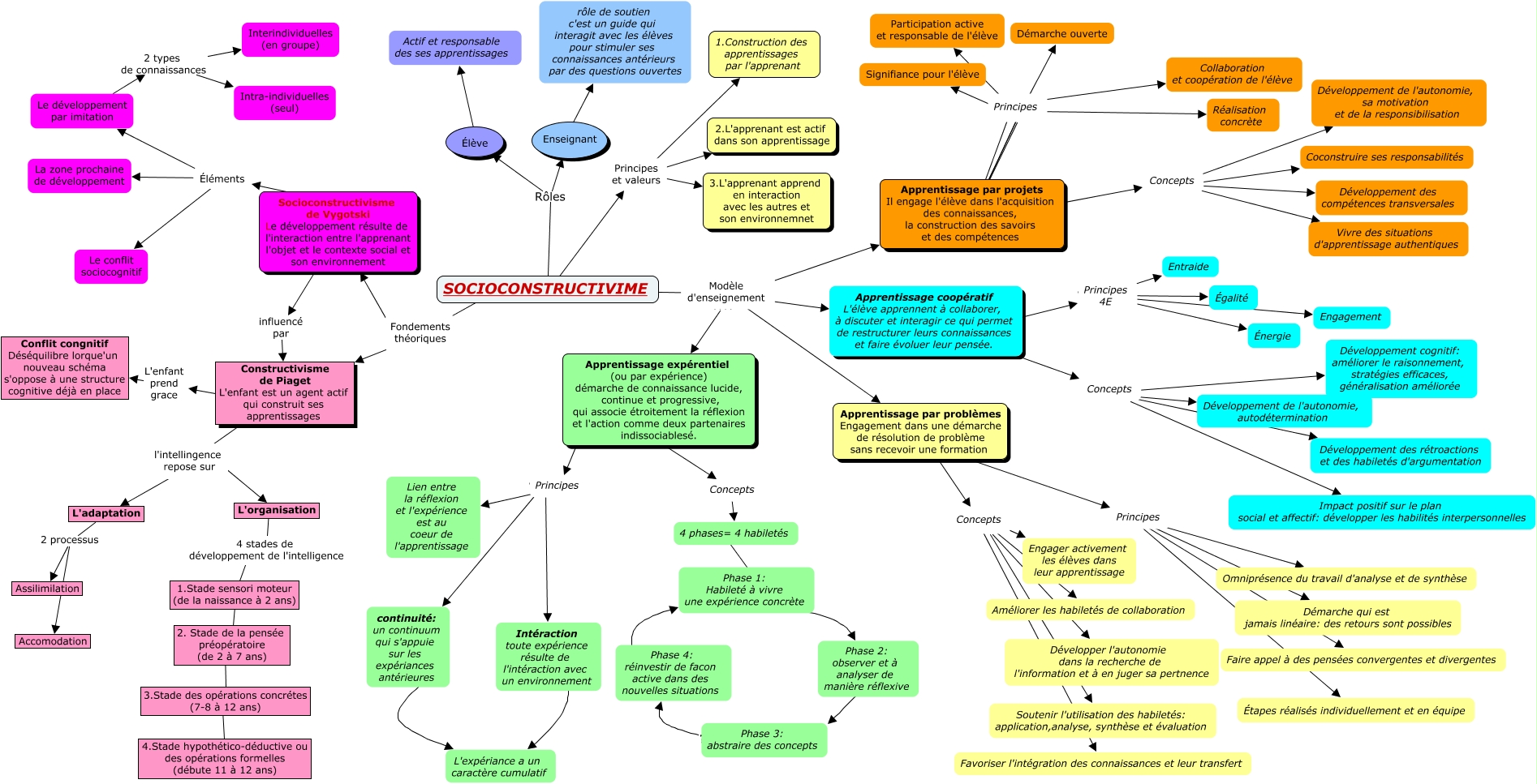 Cette carte de concepts créée avec IHMC CmapTools traite de: Jihen, 3.Stade des opérations concrétes (7-8 à 12 ans) ???? 4.Stade hypothético-déductive ou des opérations formelles (débute 11 à 12 ans), Concepts ???? Coconstruire ses responsabilités, Principes ???? Lien entre la réflexion et l'expérience est au coeur de l'apprentissage, Socioconstructivisme de Vygotski Le développement résulte de l'interaction entre l'apprenant l'objet et le contexte social et son environnement ???? Éléments, Apprentissage par problèmes Engagement dans une démarche de résolution de problème sans recevoir une formation ???? Concepts, Constructivisme de Piaget L'enfant est un agent actif qui construit ses apprentissages ???? l'intellingence repose sur, Phase 3: abstraire des concepts ???? Phase 4: réinvestir de facon active dans des nouvelles situations, L'adaptation 2 processus Assilimilation, 4 phases= 4 habiletés ???? Phase 1: Habileté à vivre une expérience concrète, Principes 4E ???? Énergie, Concepts ???? Développement cognitif: améliorer le raisonnement, stratégies efficaces, généralisation améliorée, L'adaptation 2 processus Accomodation, Enseignant ???? rôle de soutien c'est un guide qui interagit avec les élèves pour stimuler ses connaissances antérieurs par des questions ouvertes, l'intellingence repose sur ???? L'organisation, Élève ???? Actif et responsable des ses apprentissages, Principes ???? continuité: un continuum qui s'appuie sur les expériances antérieures, Principes ???? Étapes réalisés individuellement et en équipe, SOCIOCONSTRUCTIVIME Rôles Élève, Principes et valeurs ???? 2.L'apprenant est actif dans son apprentissage, Constructivisme de Piaget L'enfant est un agent actif qui construit ses apprentissages L'enfant prend grace Conflit congnitif Déséquilibre lorque'un nouveau schéma s'oppose à une structure cognitive déjà en place