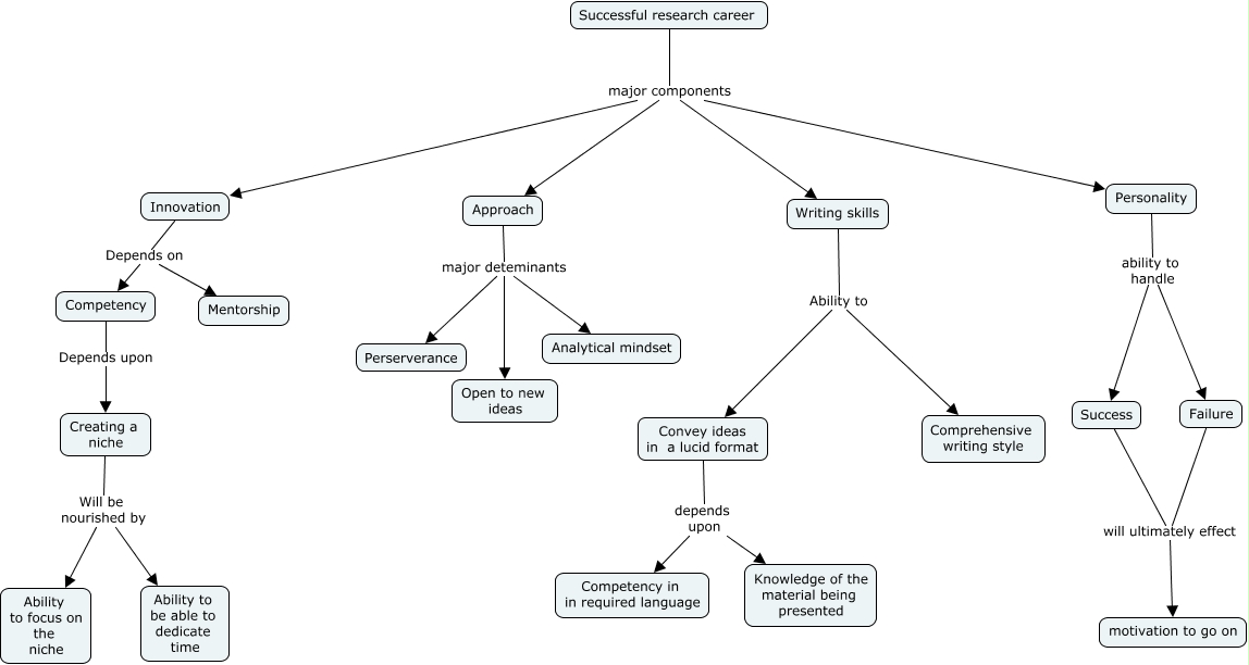 Este Cmap, tiene información relacionada con: Investigación 1, Success will ultimately effect motivation to go on, Writing skills Ability to Comprehensive writing style, Convey ideas in a lucid format depends upon Competency in in required language, Innovation Depends on Mentorship, Successful research career major components Innovation, Successful research career major components Personality, Personality ability to handle Success, Innovation Depends on Competency, Successful research career major components Approach, Approach major deteminants Open to new ideas, Approach major deteminants Analytical mindset, Approach major deteminants Perserverance, Creating a niche Will be nourished by Ability to focus on the niche, Writing skills Ability to Convey ideas in a lucid format, Creating a niche Will be nourished by Ability to be able to dedicate time, Competency Depends upon Creating a niche, Failure will ultimately effect motivation to go on, Personality ability to handle Failure, Convey ideas in a lucid format depends upon Knowledge of the material being presented, Successful research career major components Writing skills