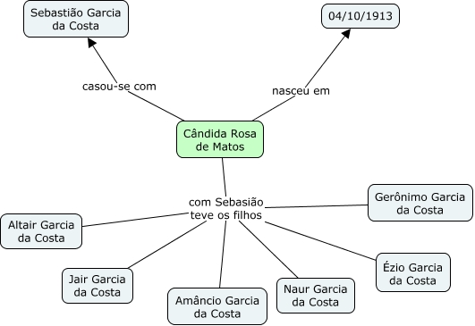Esse mapa conceitual, produzido no IHMC CmapTools, tem a informação relacionada a: Cândida Rosa de Matos, Cândida Rosa de Matos nasceu em 04/10/1913, Cândida Rosa de Matos com Sebasião teve os filhos Naur Garcia da Costa, Cândida Rosa de Matos com Sebasião teve os filhos Jair Garcia da Costa, Cândida Rosa de Matos com Sebasião teve os filhos Amâncio Garcia da Costa, Cândida Rosa de Matos com Sebasião teve os filhos Ézio Garcia da Costa, Cândida Rosa de Matos casou-se com Sebastião Garcia da Costa, Cândida Rosa de Matos com Sebasião teve os filhos Altair Garcia da Costa, Cândida Rosa de Matos com Sebasião teve os filhos Gerônimo Garcia da Costa