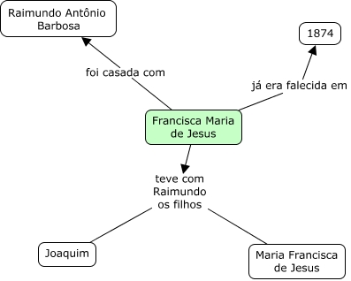 Esse mapa conceitual, produzido no IHMC CmapTools, tem a informação relacionada a: Francisca Maria de Jesus, Francisca Maria de Jesus já era falecida em 1874, Francisca Maria de Jesus teve com Raimundo os filhos Maria Francisca de Jesus, Francisca Maria de Jesus foi casada com Raimundo Antônio Barbosa, Francisca Maria de Jesus teve com Raimundo os filhos Joaquim