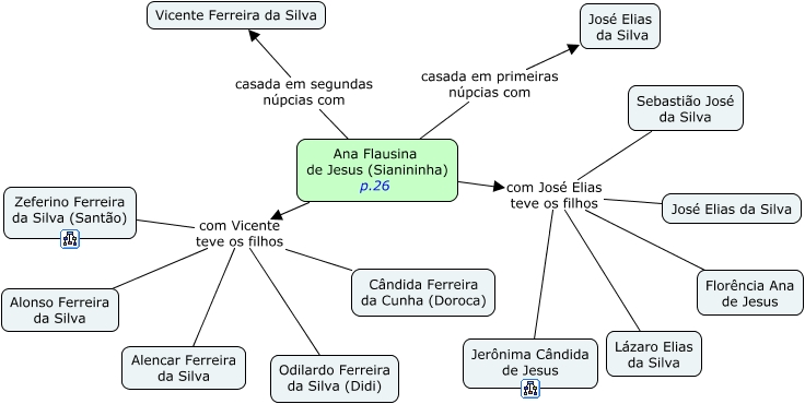Esse mapa conceitual, produzido no IHMC CmapTools, tem a informação relacionada a: Ana Flausina de Jesus _Sianininha, Ana Flausina de Jesus (Sianininha) p.26 com José Elias teve os filhos José Elias da Silva, Ana Flausina de Jesus (Sianininha) p.26 com Vicente teve os filhos Zeferino Ferreira da Silva (Santão), Ana Flausina de Jesus (Sianininha) p.26 com Vicente teve os filhos Cândida Ferreira da Cunha (Doroca), Ana Flausina de Jesus (Sianininha) p.26 com José Elias teve os filhos Sebastião José da Silva, Ana Flausina de Jesus (Sianininha) p.26 casada em segundas núpcias com Vicente Ferreira da Silva, Ana Flausina de Jesus (Sianininha) p.26 com Vicente teve os filhos Odilardo Ferreira da Silva (Didi), Ana Flausina de Jesus (Sianininha) p.26 com José Elias teve os filhos Lázaro Elias da Silva, Ana Flausina de Jesus (Sianininha) p.26 com José Elias teve os filhos Florência Ana de Jesus, Ana Flausina de Jesus (Sianininha) p.26 com Vicente teve os filhos Alencar Ferreira da Silva, Ana Flausina de Jesus (Sianininha) p.26 casada em primeiras núpcias com José Elias da Silva, Ana Flausina de Jesus (Sianininha) p.26 com José Elias teve os filhos Jerônima Cândida de Jesus, Ana Flausina de Jesus (Sianininha) p.26 com Vicente teve os filhos Alonso Ferreira da Silva