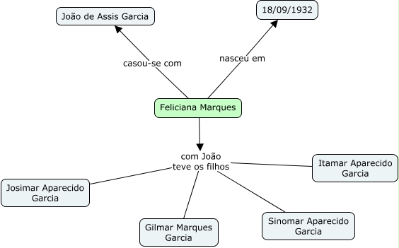 Esse mapa conceitual, produzido no IHMC CmapTools, tem a informação relacionada a: Feliciana Marques, Feliciana Marques com João teve os filhos Sinomar Aparecido Garcia, Feliciana Marques com João teve os filhos Itamar Aparecido Garcia, Feliciana Marques com João teve os filhos Gilmar Marques Garcia, Feliciana Marques casou-se com João de Assis Garcia, Feliciana Marques com João teve os filhos Josimar Aparecido Garcia, Feliciana Marques nasceu em 18/09/1932