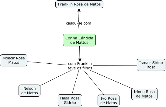 Esse mapa conceitual, produzido no IHMC CmapTools, tem a informação relacionada a: Corina Candida de Mattos, Corina Cândida de Mattos com Franklin teve os filhos Nelson de Matos, Corina Cândida de Mattos com Franklin teve os filhos Hilda Rosa Gidrão, Corina Cândida de Mattos com Franklin teve os filhos Ivo Rosa de Matos, Corina Cândida de Mattos com Franklin teve os filhos Irineu Rosa de Matos, Corina Cândida de Mattos com Franklin teve os filhos Moacir Rosa Matos, Corina Cândida de Mattos com Franklin teve os filhos Ismair Sirino Rosa, Corina Cândida de Mattos casou-se com Franklin Rosa de Matos