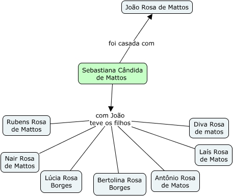 Esse mapa conceitual, produzido no IHMC CmapTools, tem a informação relacionada a: Sebastiana Candida de Mattos, Sebastiana Cândida de Mattos com João teve os filhos Antônio Rosa de Matos, Sebastiana Cândida de Mattos com João teve os filhos Diva Rosa de matos, Sebastiana Cândida de Mattos foi casada com João Rosa de Mattos, Sebastiana Cândida de Mattos com João teve os filhos Laís Rosa de Matos, Sebastiana Cândida de Mattos com João teve os filhos Nair Rosa de Mattos, Sebastiana Cândida de Mattos com João teve os filhos Rubens Rosa de Mattos, Sebastiana Cândida de Mattos com João teve os filhos Bertolina Rosa Borges, Sebastiana Cândida de Mattos com João teve os filhos Lúcia Rosa Borges