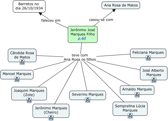 Esse mapa conceitual, produzido no IHMC CmapTools, tem a informação relacionada a: Jerônimo José Marques Filho, Jerônimo José Marques Filho p.60 teve com Ana Rosa os filhos Manoel Marques, Jerônimo José Marques Filho p.60 teve com Ana Rosa os filhos Cândida Rosa de Matos, Jerônimo José Marques Filho p.60 teve com Ana Rosa os filhos Jerônimo Marques (Cheiro), Jerônimo José Marques Filho p.60 teve com Ana Rosa os filhos Joaquim Marques (Zote), Jerônimo José Marques Filho p.60 faleceu em Barretos no dia 26/10/1934, Jerônimo José Marques Filho p.60 teve com Ana Rosa os filhos Semprelina Lúcia Marques, Jerônimo José Marques Filho p.60 teve com Ana Rosa os filhos Feliciana Marques, Jerônimo José Marques Filho p.60 teve com Ana Rosa os filhos Severino Marques, Jerônimo José Marques Filho p.60 casou-se com Ana Rosa de Matos, Jerônimo José Marques Filho p.60 teve com Ana Rosa os filhos Arnaldo Marques, Jerônimo José Marques Filho p.60 teve com Ana Rosa os filhos José Alberto Marques