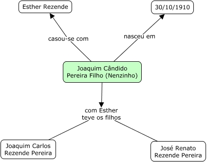 Esse mapa conceitual, produzido no IHMC CmapTools, tem a informação relacionada a: Joaquim Candido Pereira Filho_Nenzinho, Joaquim Cândido Pereira Filho (Nenzinho) nasceu em 30/10/1910, Joaquim Cândido Pereira Filho (Nenzinho) com Esther teve os filhos José Renato Rezende Pereira, Joaquim Cândido Pereira Filho (Nenzinho) casou-se com Esther Rezende, Joaquim Cândido Pereira Filho (Nenzinho) com Esther teve os filhos Joaquim Carlos Rezende Pereira