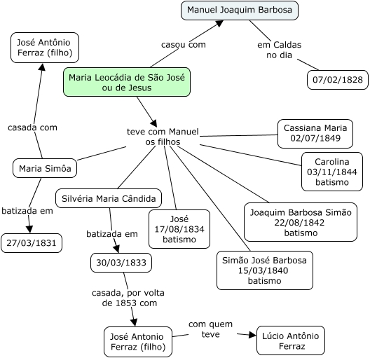 Esse mapa conceitual, produzido no IHMC CmapTools, tem a informação relacionada a: Maria Leocádia, Maria Leocádia de São José ou de Jesus teve com Manuel os filhos Silvéria Maria Cândida, Maria Leocádia de São José ou de Jesus teve com Manuel os filhos Carolina 03/11/1844 batismo, Silvéria Maria Cândida batizada em 30/03/1833, Maria Leocádia de São José ou de Jesus teve com Manuel os filhos Joaquim Barbosa Simão 22/08/1842 batismo, José Antonio Ferraz (filho) com quem teve Lúcio Antônio Ferraz, Maria Leocádia de São José ou de Jesus teve com Manuel os filhos Maria Simôa, 30/03/1833 casada, por volta de 1853 com José Antonio Ferraz (filho), Maria Leocádia de São José ou de Jesus teve com Manuel os filhos José 17/08/1834 batismo, Maria Simôa batizada em 27/03/1831, Maria Simôa casada com José Antônio Ferraz (filho), Maria Leocádia de São José ou de Jesus teve com Manuel os filhos Simão José Barbosa 15/03/1840 batismo, Maria Leocádia de São José ou de Jesus teve com Manuel os filhos Cassiana Maria 02/07/1849, Maria Leocádia de São José ou de Jesus casou com Manuel Joaquim Barbosa, Manuel Joaquim Barbosa em Caldas no dia 07/02/1828