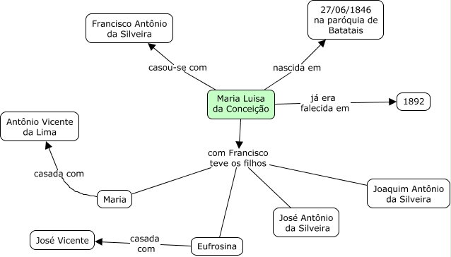Esse mapa conceitual, produzido no IHMC CmapTools, tem a informação relacionada a: Maria Luisa da Conceição, Maria Luisa da Conceição com Francisco teve os filhos José Antônio da Silveira, Maria Luisa da Conceição já era falecida em 1892, Maria Luisa da Conceição com Francisco teve os filhos Eufrosina, Maria Luisa da Conceição com Francisco teve os filhos Maria, Maria Luisa da Conceição nascida em 27/06/1846 na paróquia de Batatais, Maria casada com Antônio Vicente da Lima, Maria Luisa da Conceição com Francisco teve os filhos Joaquim Antônio da Silveira, Maria Luisa da Conceição casou-se com Francisco Antônio da Silveira, Eufrosina casada com José Vicente
