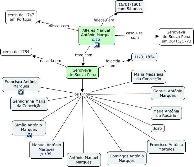 Esse mapa conceitual, produzido no IHMC CmapTools, tem a informação relacionada a: Os Marques Librinas de Barretos, Alferes Manuel Antônio Marques p.12 nasceu em cerca de 1747 em Portugal, Genoveva de Souza Pena os filhos Gabriel Antônio Marques, Genoveva de Souza Pena os filhos Antônio Manuel Marques, Alferes Manuel Antônio Marques p.12 teve com Genoveva de Souza Pena, Genoveva de Souza Pena os filhos Domingos Antônio Marques, Genoveva de Souza Pena os filhos Francisca Antônia Marques, Genoveva de Souza Pena falecida em 11/011824, Genoveva de Souza Pena os filhos Maria Madalena da Conceição, Genoveva de Souza Pena os filhos Simão Antônio Marques, Genoveva de Souza Pena os filhos Maria Antônia do Rosário, Genoveva de Souza Pena os filhos Manuel Antônio Marques p.108, Genoveva de Souza Pena os filhos Francisco Antônio Marques, Genoveva de Souza Pena os filhos João, Genoveva de Souza Pena nascida em cerca de 1754, Alferes Manuel Antônio Marques p.12 casou-se com Genoveva de Souza Pena em 26/11/1773, Alferes Manuel Antônio Marques p.12 faleceu em 16/01/1801 com 54 anos, Genoveva de Souza Pena os filhos Senhorinha Maria da Conceição