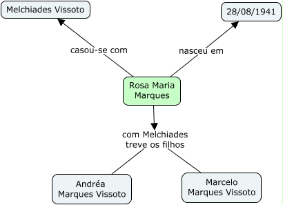 Esse mapa conceitual, produzido no IHMC CmapTools, tem a informação relacionada a: Rosa Maria Marques, Rosa Maria Marques nasceu em 28/08/1941, Rosa Maria Marques com Melchiades treve os filhos Marcelo Marques Vissoto, Rosa Maria Marques casou-se com Melchiades Vissoto, Rosa Maria Marques com Melchiades treve os filhos Andréa Marques Vissoto