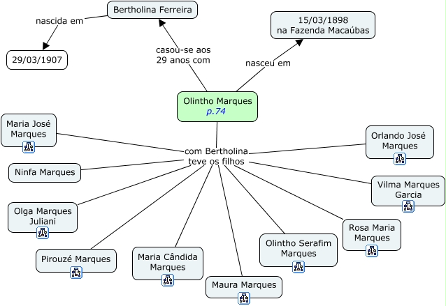 Esse mapa conceitual, produzido no IHMC CmapTools, tem a informação relacionada a: Olintho Marques, Olintho Marques p.74 com Bertholina teve os filhos Orlando José Marques, Olintho Marques p.74 com Bertholina teve os filhos Maria Cândida Marques, Olintho Marques p.74 casou-se aos 29 anos com Bertholina Ferreira, Olintho Marques p.74 com Bertholina teve os filhos Ninfa Marques, Olintho Marques p.74 nasceu em 15/03/1898 na Fazenda Macaúbas, Olintho Marques p.74 com Bertholina teve os filhos Olintho Serafim Marques, Olintho Marques p.74 com Bertholina teve os filhos Maria José Marques, Bertholina Ferreira nascida em 29/03/1907, Olintho Marques p.74 com Bertholina teve os filhos Olga Marques Juliani, Olintho Marques p.74 com Bertholina teve os filhos Vilma Marques Garcia, Olintho Marques p.74 com Bertholina teve os filhos Maura Marques, Olintho Marques p.74 com Bertholina teve os filhos Pirouzé Marques, Olintho Marques p.74 com Bertholina teve os filhos Rosa Maria Marques