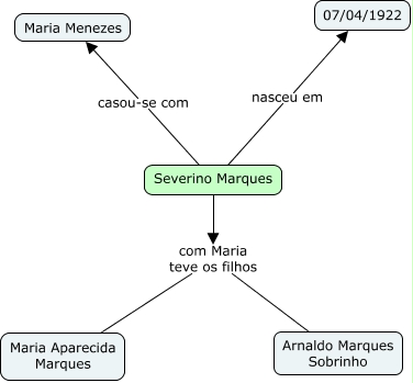 Esse mapa conceitual, produzido no IHMC CmapTools, tem a informação relacionada a: Severino Marques, Severino Marques casou-se com Maria Menezes, Severino Marques com Maria teve os filhos Maria Aparecida Marques, Severino Marques nasceu em 07/04/1922, Severino Marques com Maria teve os filhos Arnaldo Marques Sobrinho