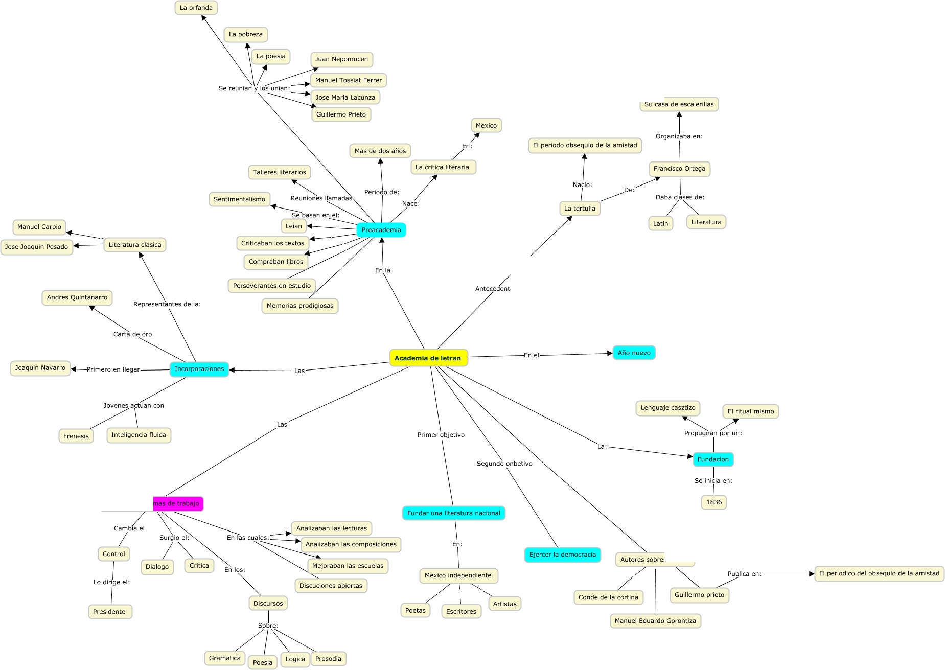 Este Cmap, tiene información relacionada con: Lit5.0, Academia de letran Segundo onbetivo Ejercer la democracia, Academia de letran Primer objetivo Fundar una literatura nacional, Reuniones y formas de trabajo Cambia el Control, Academia de letran En la Preacademia, Preacademia Leian, Reuniones y formas de trabajo Surgio el: Critica, La tertulia De: Francisco Ortega, Preacademia Se reunian y los unian: Jose Maria Lacunza, Guillermo prieto Publica en: El periodico del obsequio de la amistad, Reuniones y formas de trabajo En las cuales: Mejoraban las escuelas, Fundacion Se inicia en: 1836, Fundacion Propugnan por un: Lenguaje casztizo, Preacademia Criticaban los textos, Preacademia Se reunian y los unian: Guillermo Prieto, Fundar una literatura nacional En: Mexico independiente, Francisco Ortega Daba clases de: Literatura, Fundacion Propugnan por un: El ritual mismo, Academia de letran La: Fundacion, Reuniones y formas de trabajo En las cuales: Discuciones abiertas, Preacademia Reuniones llamadas Talleres literarios