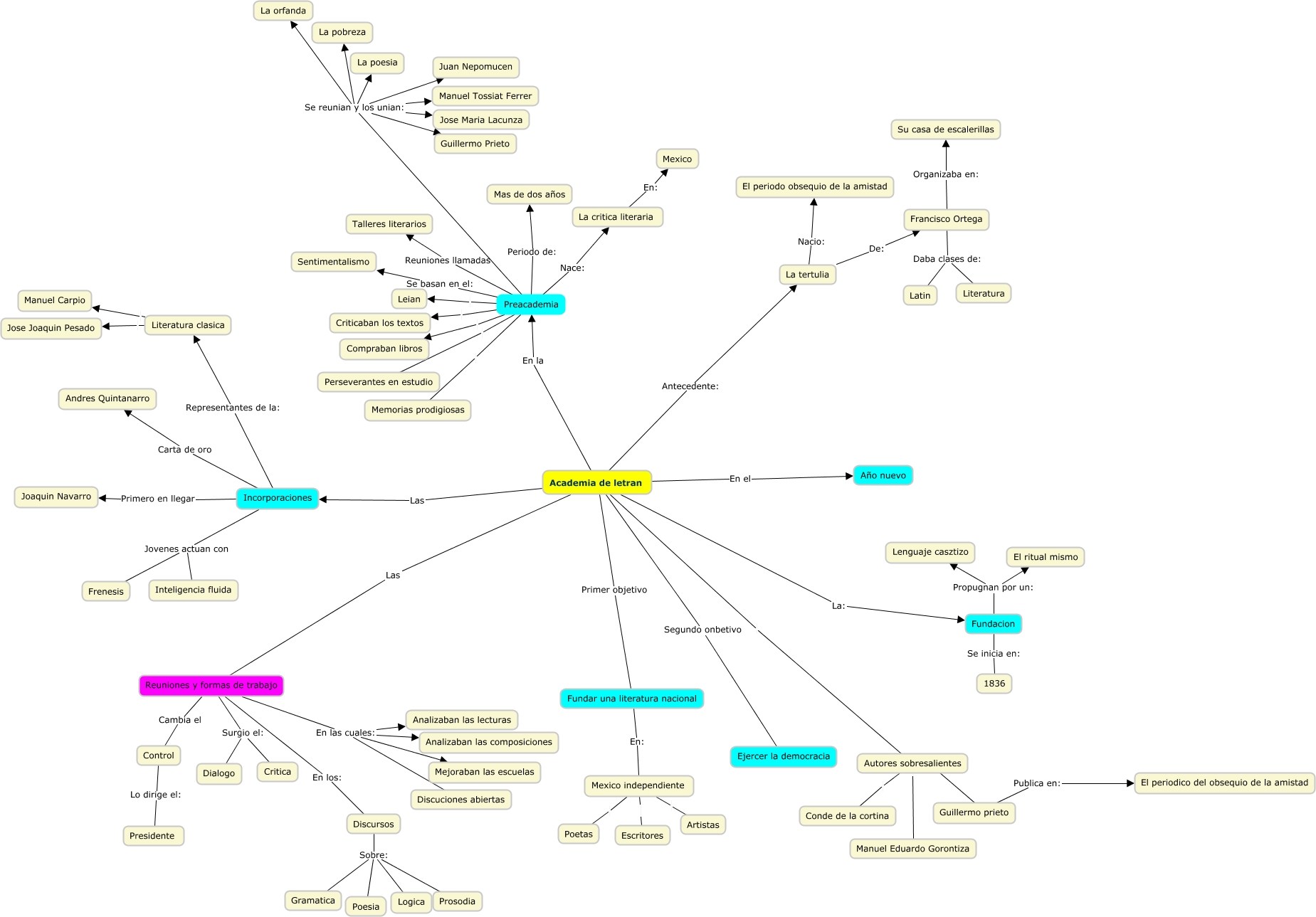 Este Cmap, tiene información relacionada con: Lit0.5, Reuniones y formas de trabajo Surgio el: Dialogo, Reuniones y formas de trabajo En las cuales: Analizaban las composiciones, Preacademia Memorias prodigiosas, Incorporaciones Carta de oro Andres Quintanarro, Francisco Ortega Daba clases de: Latin, Preacademia Leian, Academia de letran Primer objetivo Fundar una literatura nacional, Fundacion Propugnan por un: Lenguaje casztizo, Discursos Sobre: Gramatica, Preacademia Se reunian y los unian: La poesia, Academia de letran Antecedente: La tertulia, Academia de letran En la Preacademia, Preacademia Se basan en el: Sentimentalismo, Literatura clasica Jose Joaquin Pesado, La tertulia De: Francisco Ortega, Academia de letran La: Fundacion, Autores sobresalientes Conde de la cortina, Preacademia Periodo de: Mas de dos años, Reuniones y formas de trabajo En las cuales: Mejoraban las escuelas, Guillermo prieto Publica en: El periodico del obsequio de la amistad