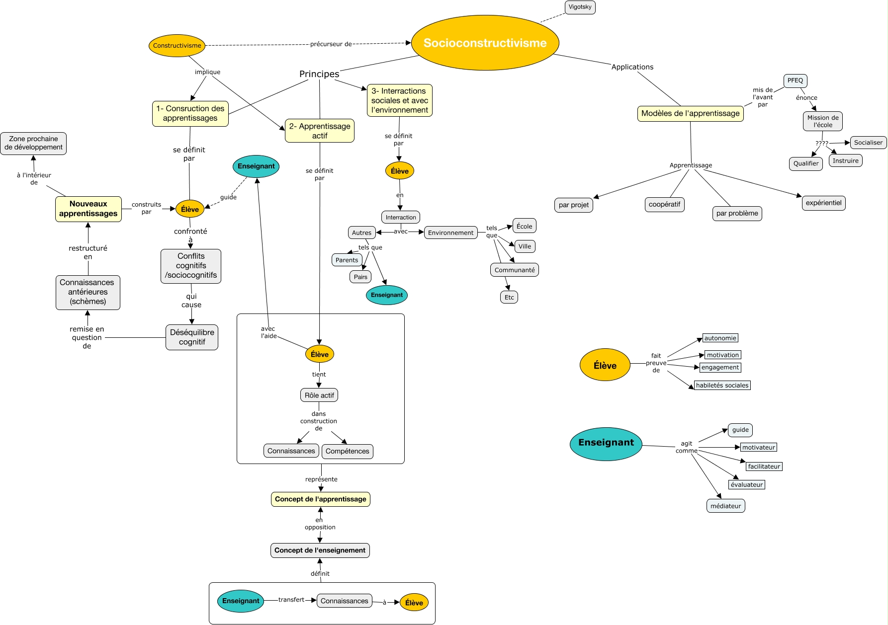 Cette carte de concepts créée avec IHMC CmapTools traite de: Socioconstructivisme, Constructivisme précurseur de Socioconstructivisme, PFEQ énonce Mission de l'école, Modèles de l'apprentissage Apprentissage par projet, Modèles de l'apprentissage Apprentissage expérientiel, Autres tels que Parents, Élève avec l'aide Enseignant, Enseignant agit comme motivateur, Rôle actif dans construction de Connaissances, Mission de l'école ???? Instruire, 3- Interractions sociales et avec l'environnement se définit par Élève, 2- Apprentissage actif se définit par Élève, Mission de l'école ???? Socialiser, Enseignant agit comme évaluateur, Élève confronté à Conflits cognitifs /sociocognitifs, Environnement tels que Ville, Connaissances antérieures (schèmes) restructuré en Nouveaux apprentissages, PFEQ mis de l'avant par Modèles de l'apprentissage, Rôle actif dans construction de Compétences, Constructivisme implique 2- Apprentissage actif, Enseignant transfert Connaissances