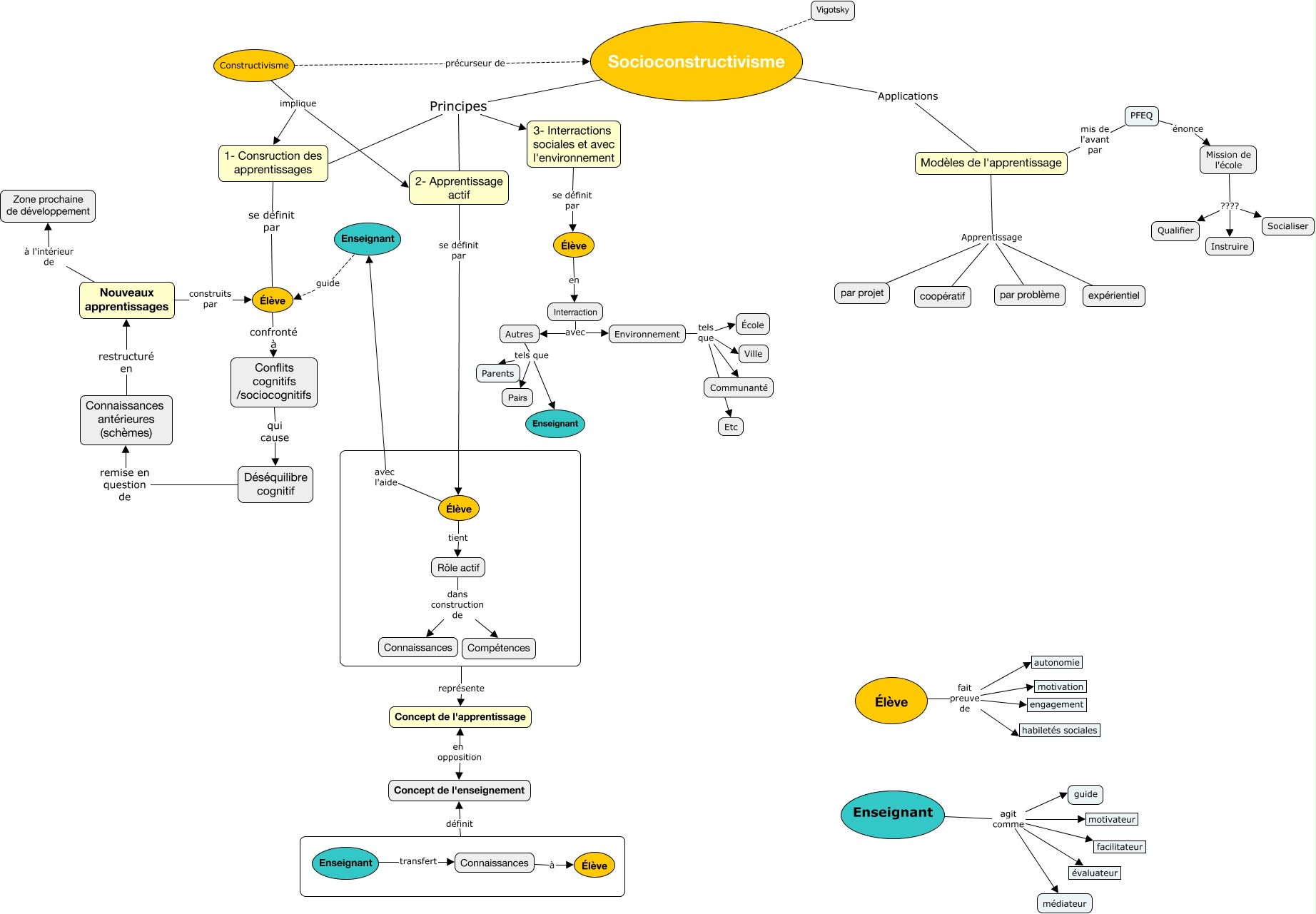 Cette carte de concepts créée avec IHMC CmapTools traite de: Sans titre1, Constructivisme précurseur de Socioconstructivisme, PFEQ énonce Mission de l'école, Modèles de l'apprentissage Apprentissage par projet, Modèles de l'apprentissage Apprentissage expérientiel, Autres tels que Parents, Élève avec l'aide Enseignant, Enseignant agit comme motivateur, Rôle actif dans construction de Connaissances, Mission de l'école ???? Instruire, 3- Interractions sociales et avec l'environnement se définit par Élève, 2- Apprentissage actif se définit par Élève, Mission de l'école ???? Socialiser, Enseignant agit comme évaluateur, Élève confronté à Conflits cognitifs /sociocognitifs, Environnement tels que Ville, Connaissances antérieures (schèmes) restructuré en Nouveaux apprentissages, PFEQ mis de l'avant par Modèles de l'apprentissage, Rôle actif dans construction de Compétences, Constructivisme implique 2- Apprentissage actif, Enseignant transfert Connaissances